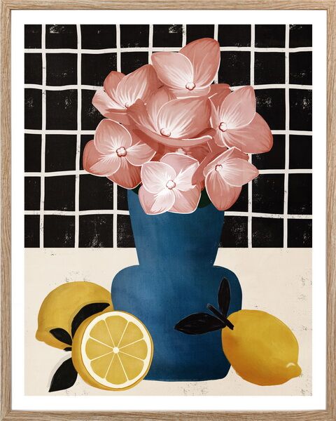 Современный натюрморт, который украсит любой интерьер. Картина сочетает яркие лимоны, розовые цветы в синей вазе и стильный геометричный фон. Контрастные цвета и лаконичный дизайн создают ощущение свежести и уюта. Идеальный акцент для кухни, столовой или гостиной.