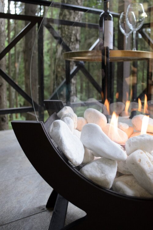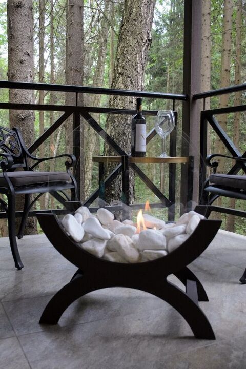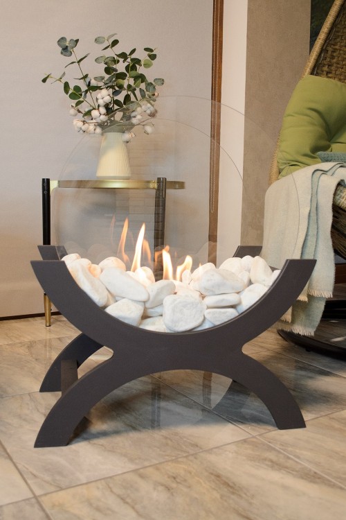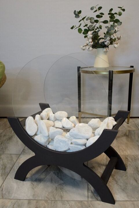 Основу его составляю деревянные стойки с поперечными планками - вырезаются они из фанеры на станке с числовым программным управление (ЧПУ), что обеспечивает исключительную точность размеров и абсолютную идентичность деталей. На рейки помещается небольшая металлическая топка со специальным наполнителем и обкладывается декоративными камнями. Наполнитель топки - каменная вата, которая не выгорает и не портится. Кроме того, она способствует равномерному распределению топлива внутри топки, что обеспечивает ровное пламя по всей линии огня. В топку наливается биотопливо (максимальный объем 0,6 литра) и зажигается при помощи каминной зажигалки. Таким образом у вас будет настоящий живой огонь, который обеспечит атмосферу тепла и уют. Время работы камина зависит от объема налитого топлива – чем его больше, тем дольше горит камин (максимальное время горения после одного наполнения горелки - 1,5 часа). Если нужно погасить огонь раньше, для топки предусмотрен пламегаситель (крышка).