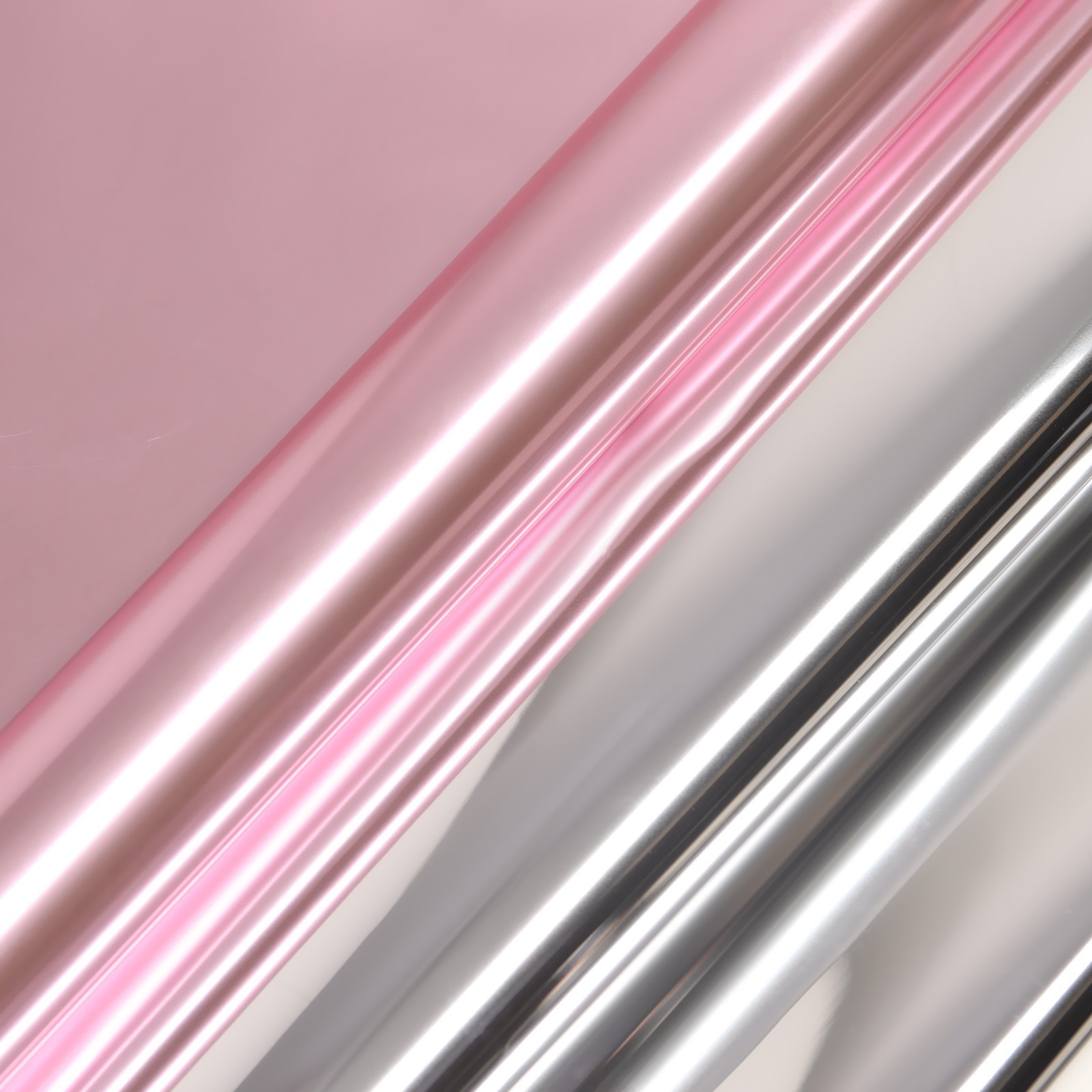 Романтичный розово-серебристый оттенок: Цвет сочетает в себе теплый розовый тон и холодное серебристое сияние. Такая гамма делает пленку особенно уместной для оформления букетов на 14 Февраля, 8 Марта, свадьбу или день рождения, подчеркивая праздничность момента.