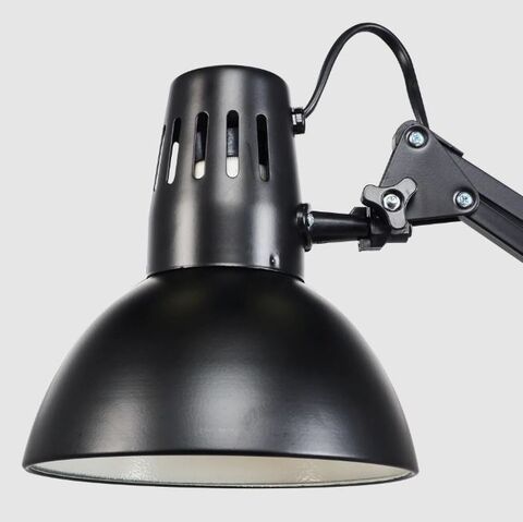 Плафон светильника изготовлен из металла. Регулируется по углу наклона и повороту. Двухзвенная стойка, изготовленная из металла, позволяет менять высоту плафона в широком диапазоне. Способ установки - струбцина. Можно использовать с любыми типами ламп, в том числе со светодиодными, мощностью до 40 Ватт. С выключателем на проводе. Длина провода 1,5 метра. Стиль офисный.