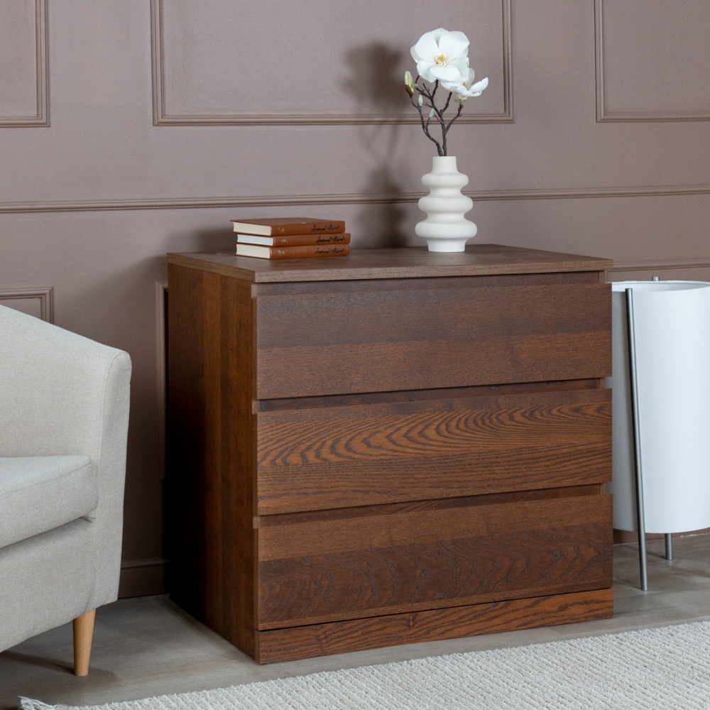 Почему выбирают комод ВАРМА ПРАЙМ 3 ящика 80х77х48? Комод ВАРМА ПРАЙМ — ультимативный комод, который позволяет организовать хранение всех необходимых вещей – в верхние необходимые мелочи, чтобы были всегда под рукой, в других – подушек, одеял, белья или одежды, ведь благодаря глубине и максимальной нагрузке 8 кг они подходят для любых целей. А на столешнице комода можно поставить все, от рамок и ваз до аквариума – ведь максимальная нагрузка на нее целых 15 кг! Компактный размер позволяет разместить его в небольших пространствах. Комод ВАРМА представлен в трех вариантах: