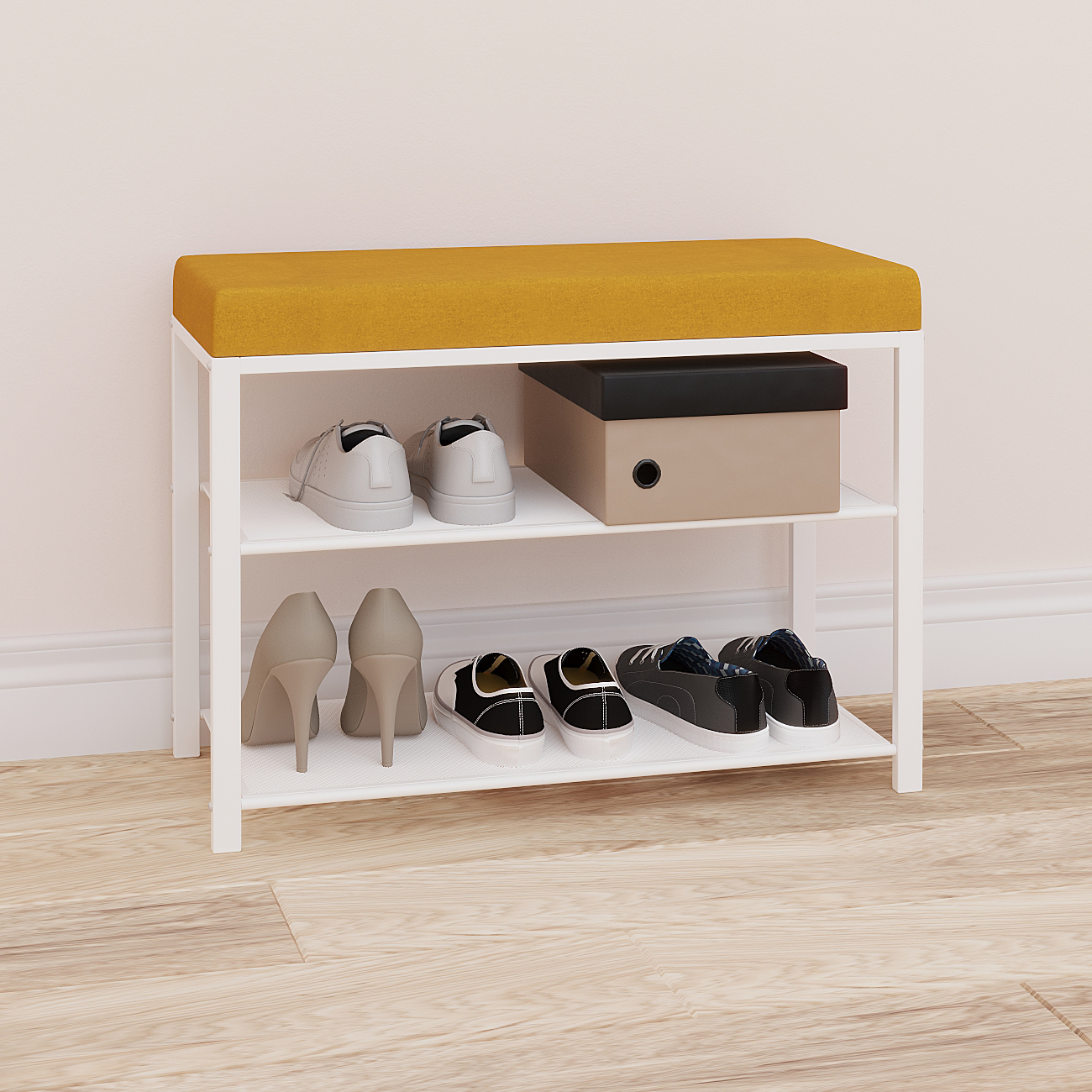 Две полки вместят до 6 пар обуви, а продуманные расстояния между ними позволят разместить как летнюю, так и зимнюю обувь.