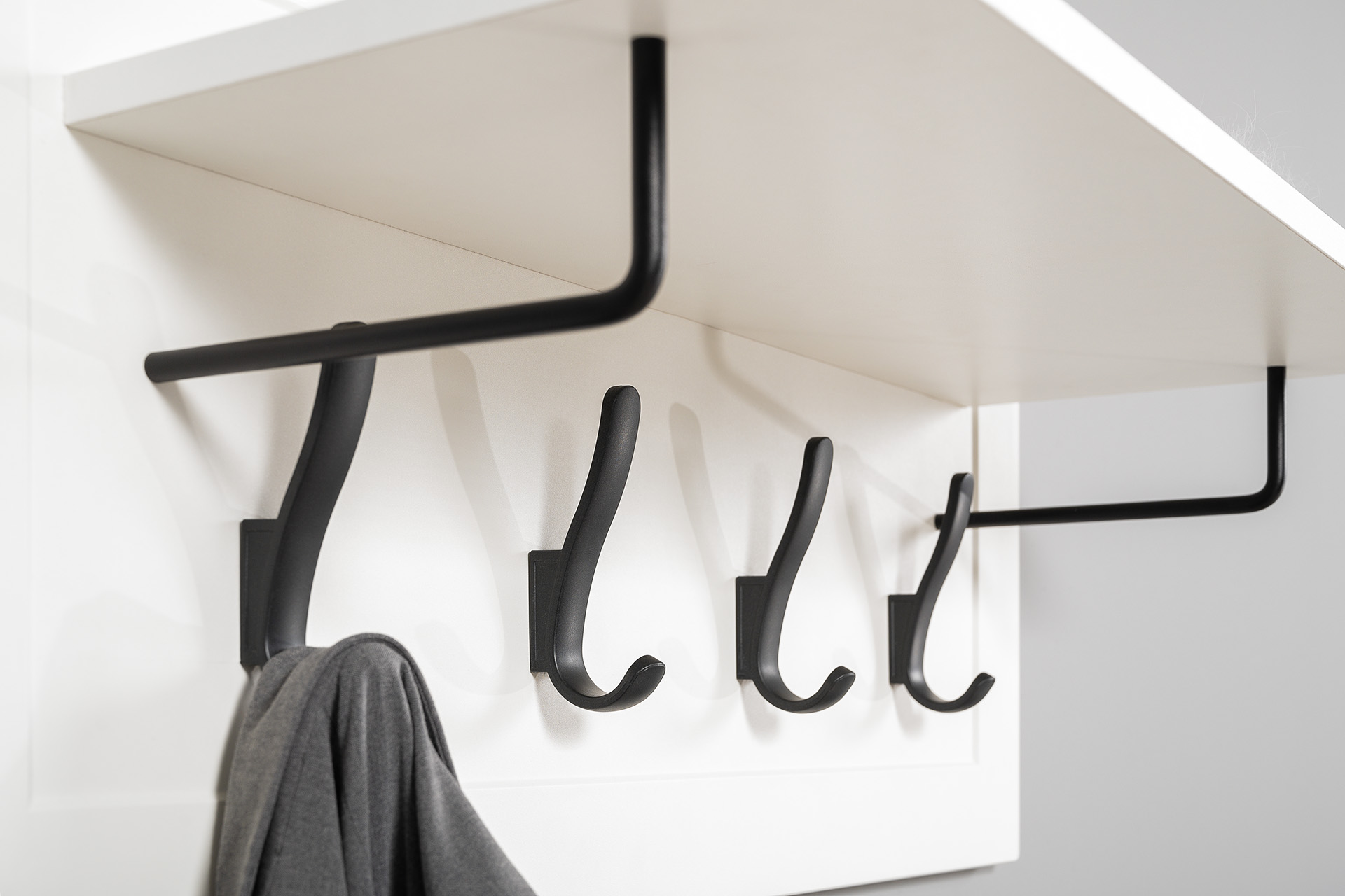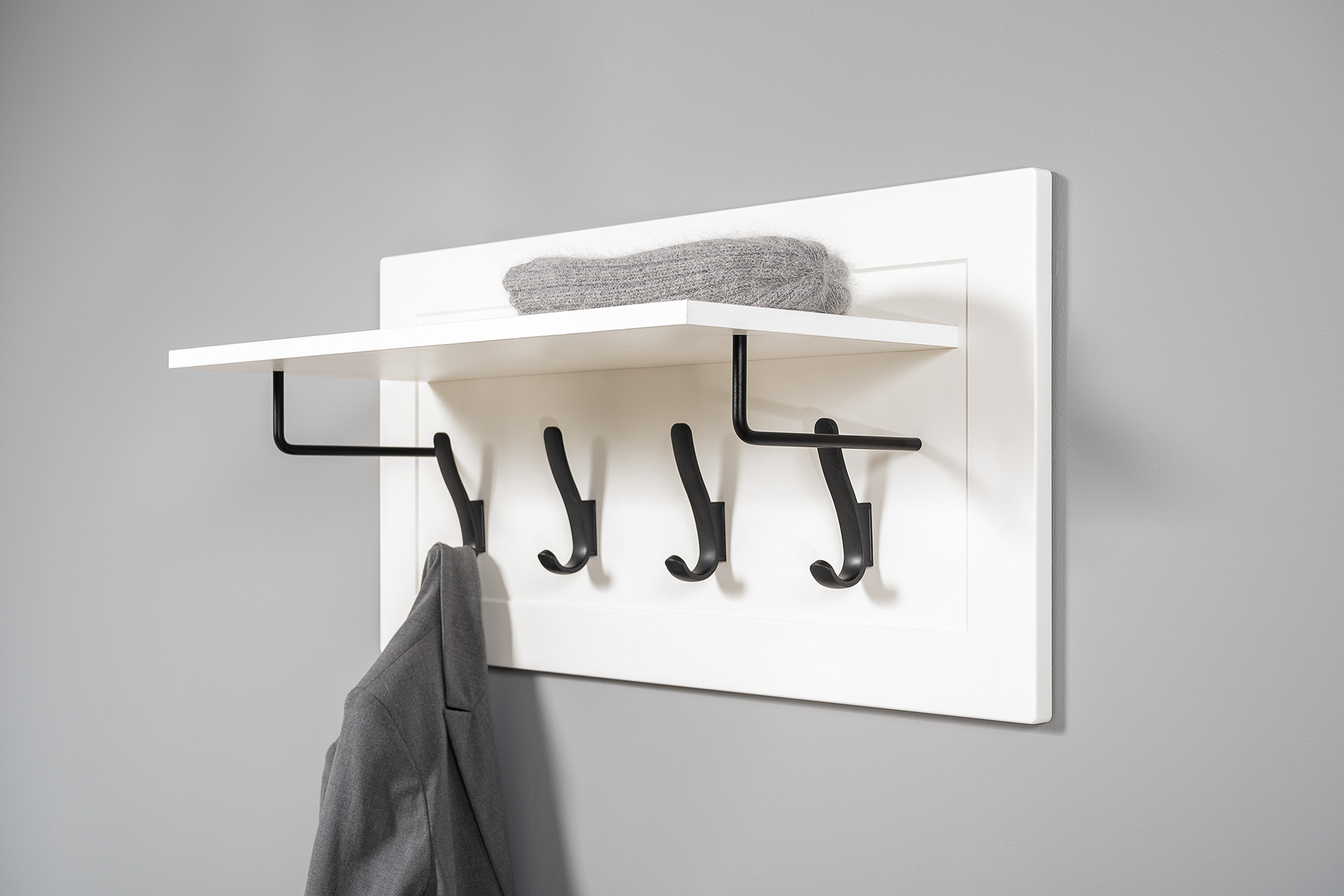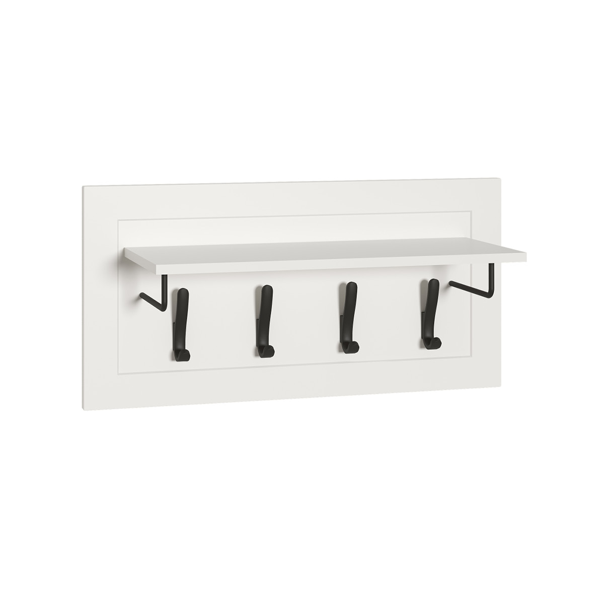 Вешалка оснащена полкой для головных уборов и 4 крючками для одежды.