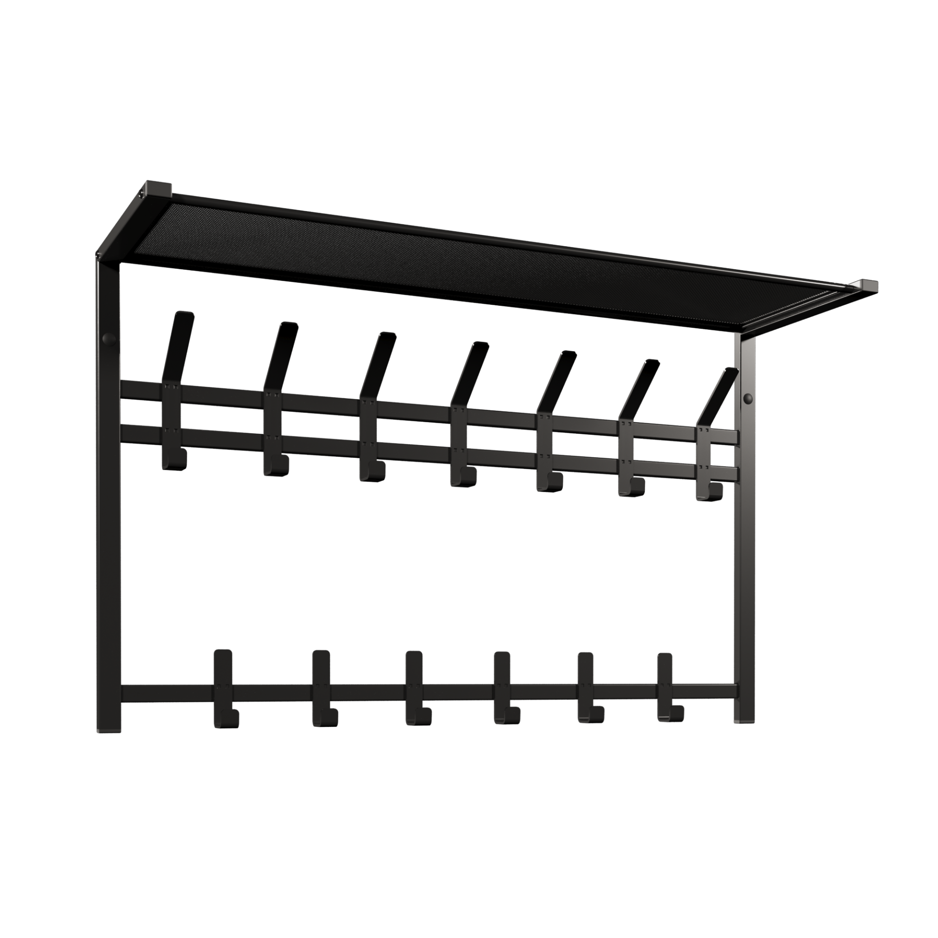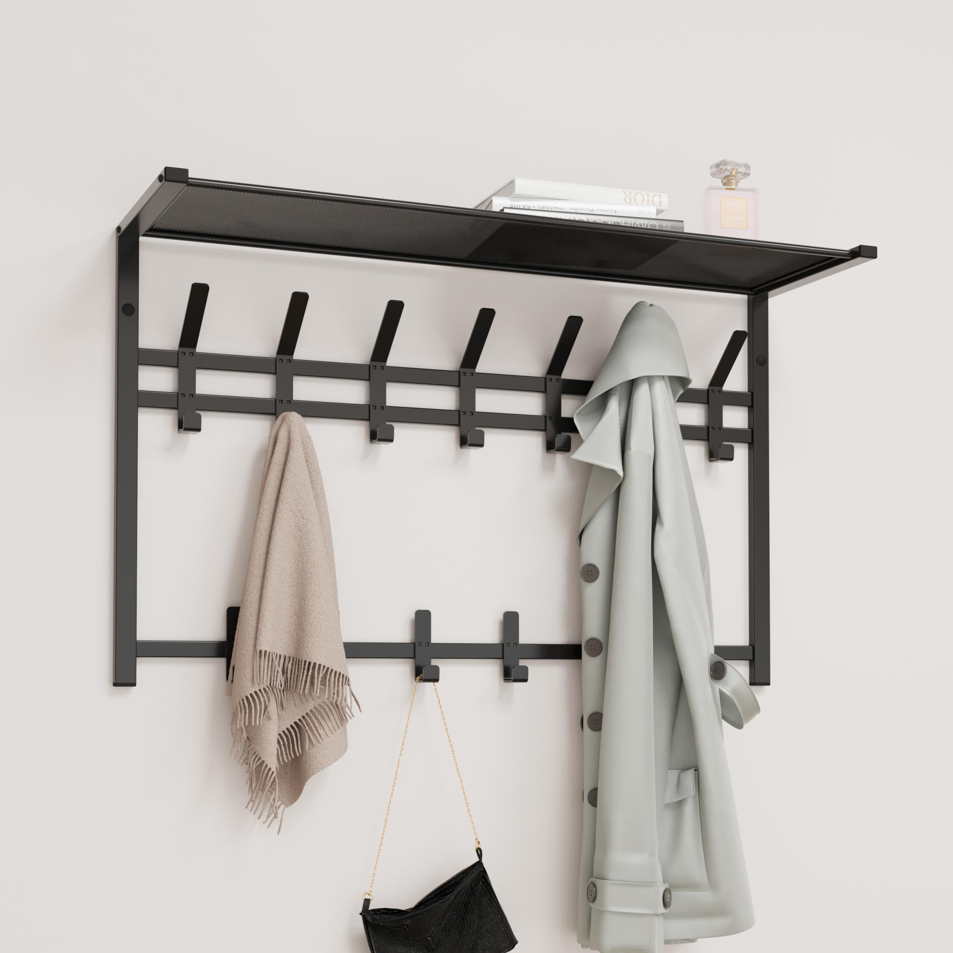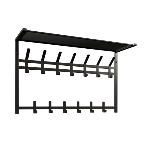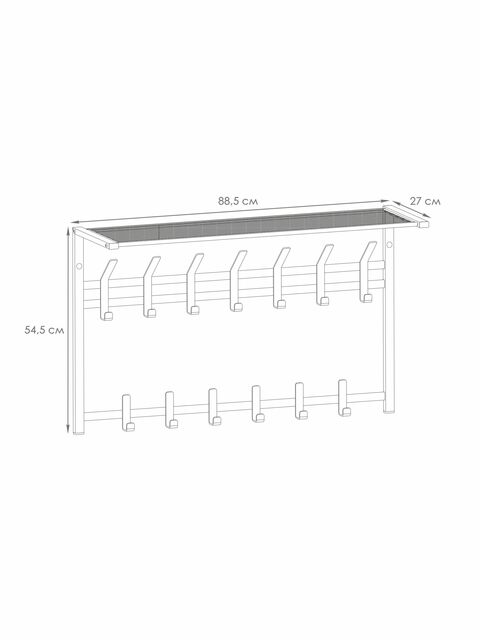 Универсальная вешалка для хранения вещей имеет 13 двойных крючков - каждый из них выдерживает до 8 кг постоянной нагрузки. На них можно разместить как куртки, так и плечики с пальто или шубой.