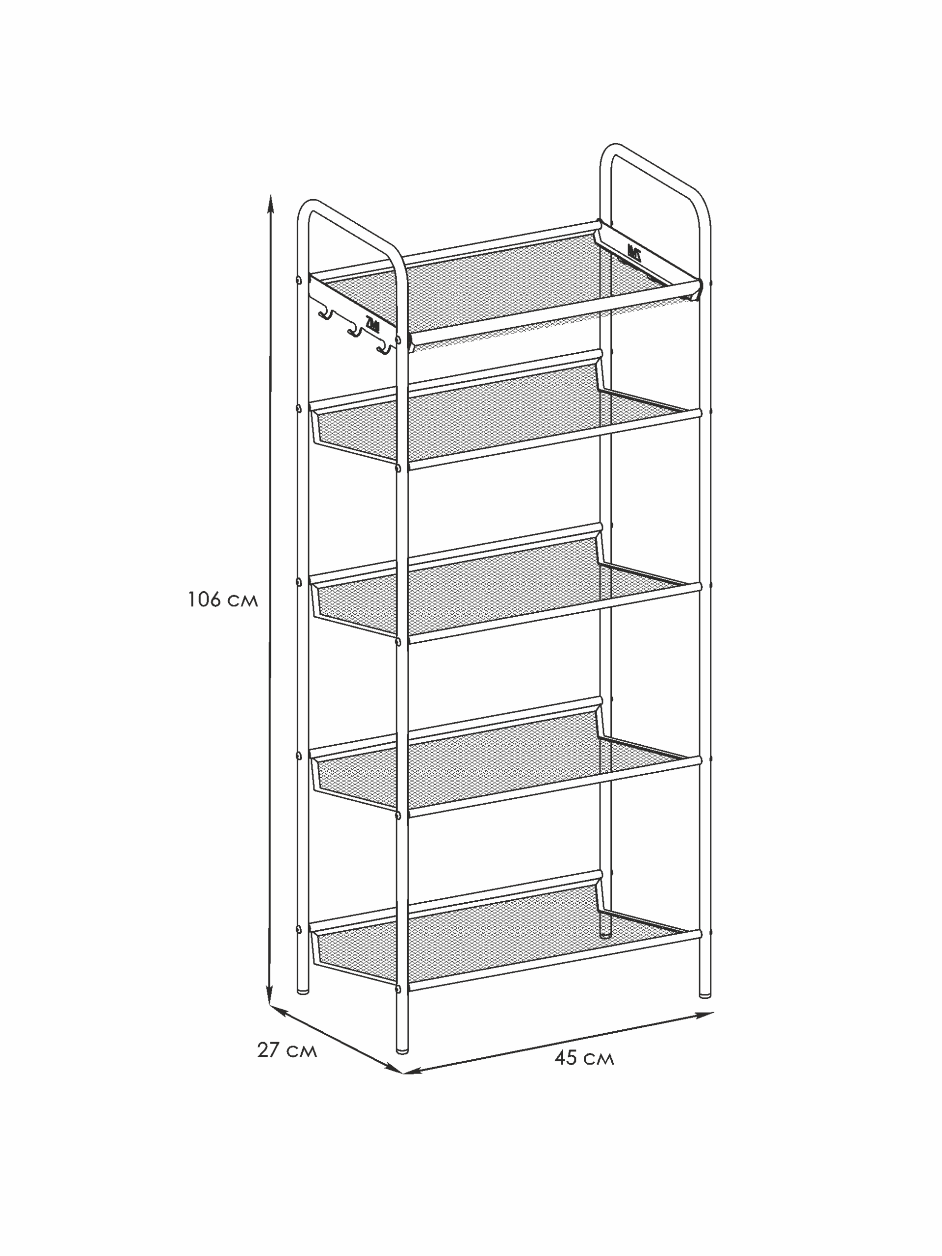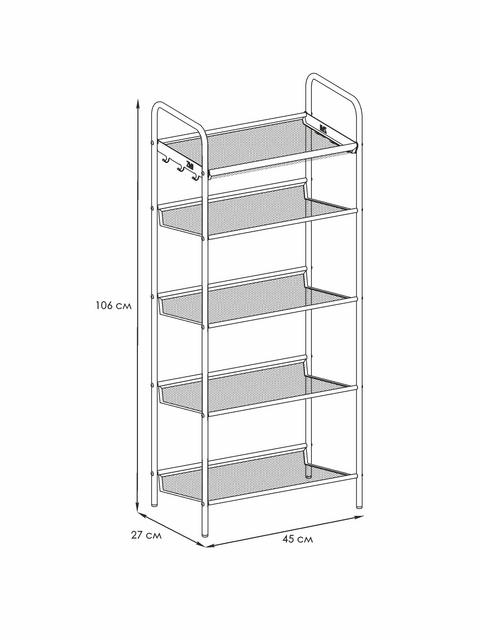 Верхняя корзина позволяет разместить разные мелочи, а боковые крючки – ложку для обуви и ключи.