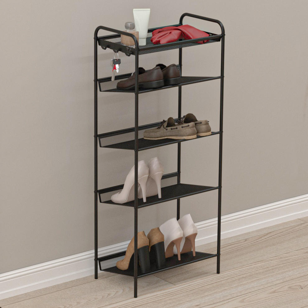 Долговечная, благодаря каркасу и полкам из стали. Четыре полки вместят до 8 пар обуви, а продуманные расстояния между ними позволят разместить как летнюю, так и зимнюю обувь. Благодаря наклону полок и бортикам ваши стены будут чистые. Каждая полка выдерживает нагрузку до 8 кг.