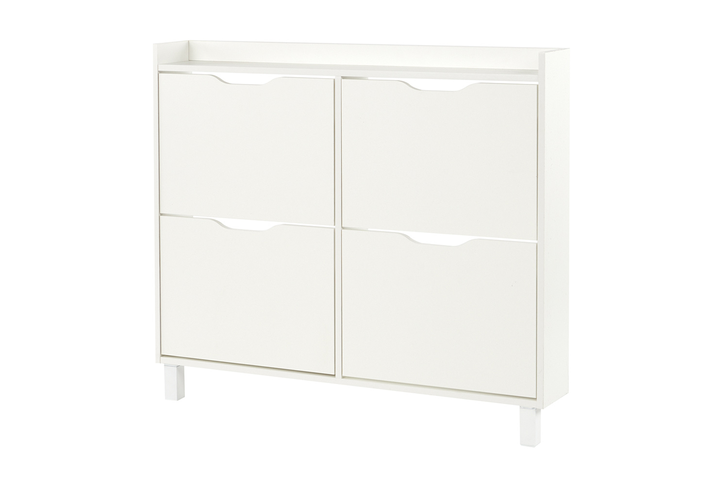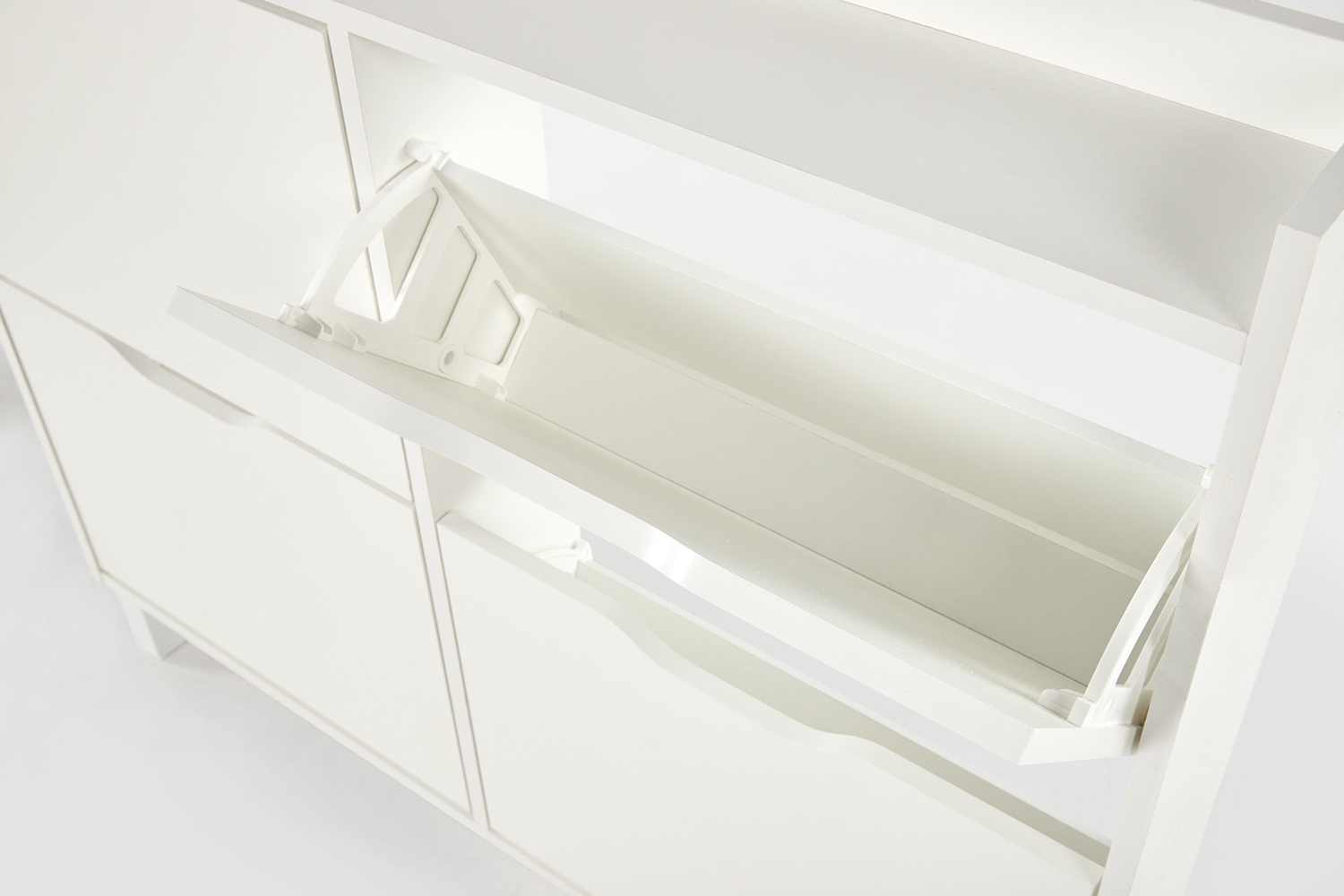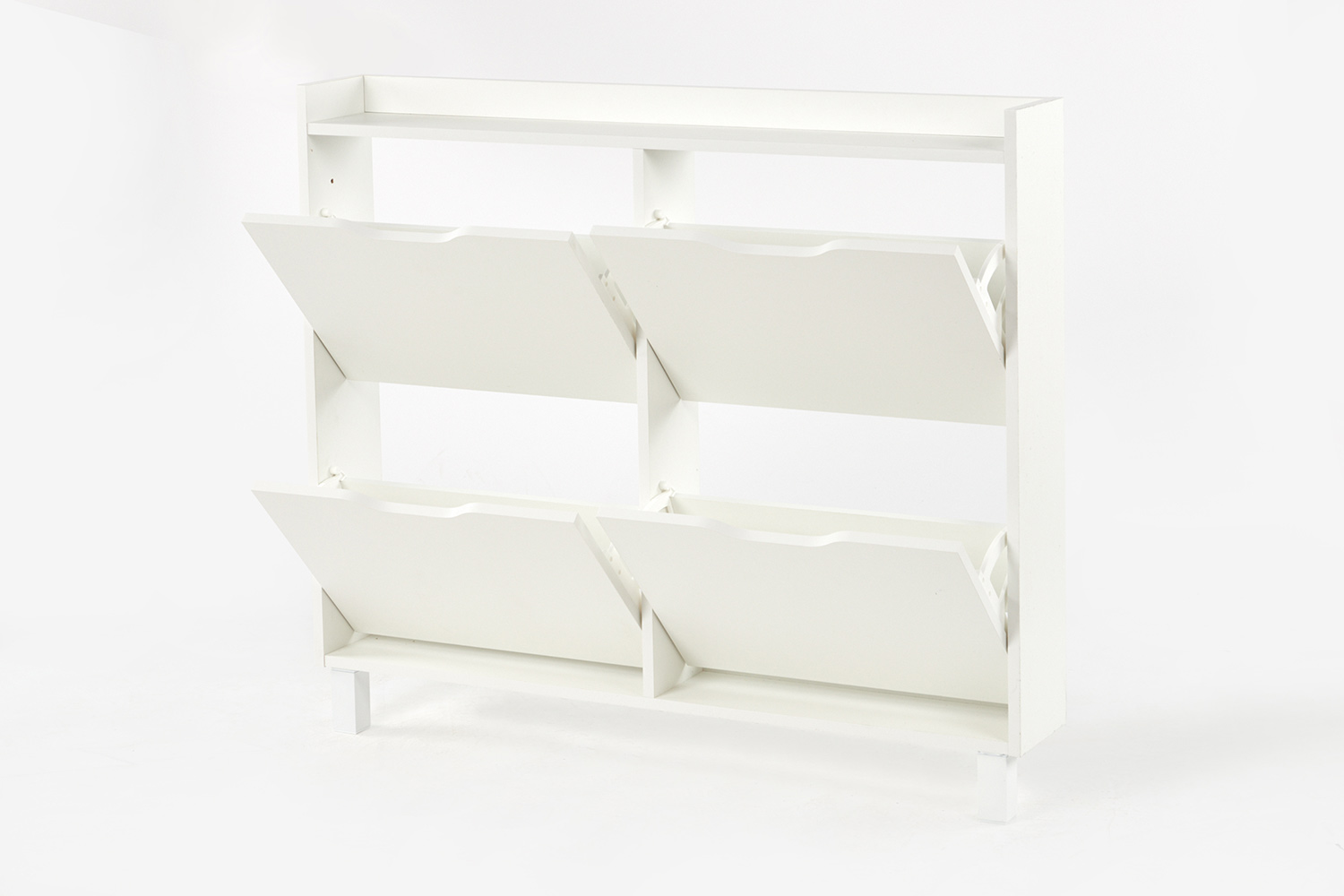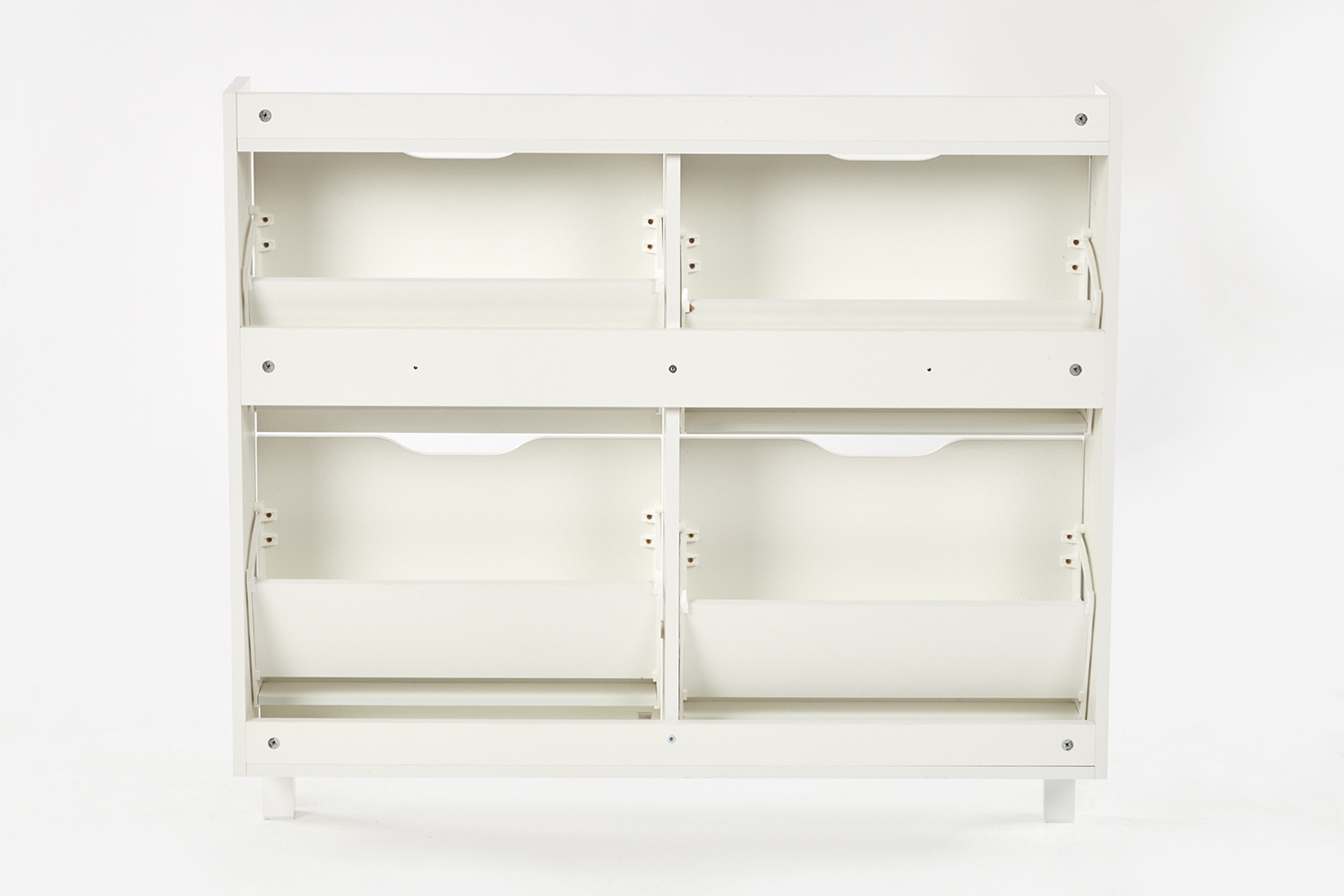 Обувница разделена на 4 независимые секции с откидным механизмом открывания. Каждая из них вмещает по 4 пары невысокой обуви. Вместо мебельных ручек на фасадах предусмотрены специальные выемки для захвата.