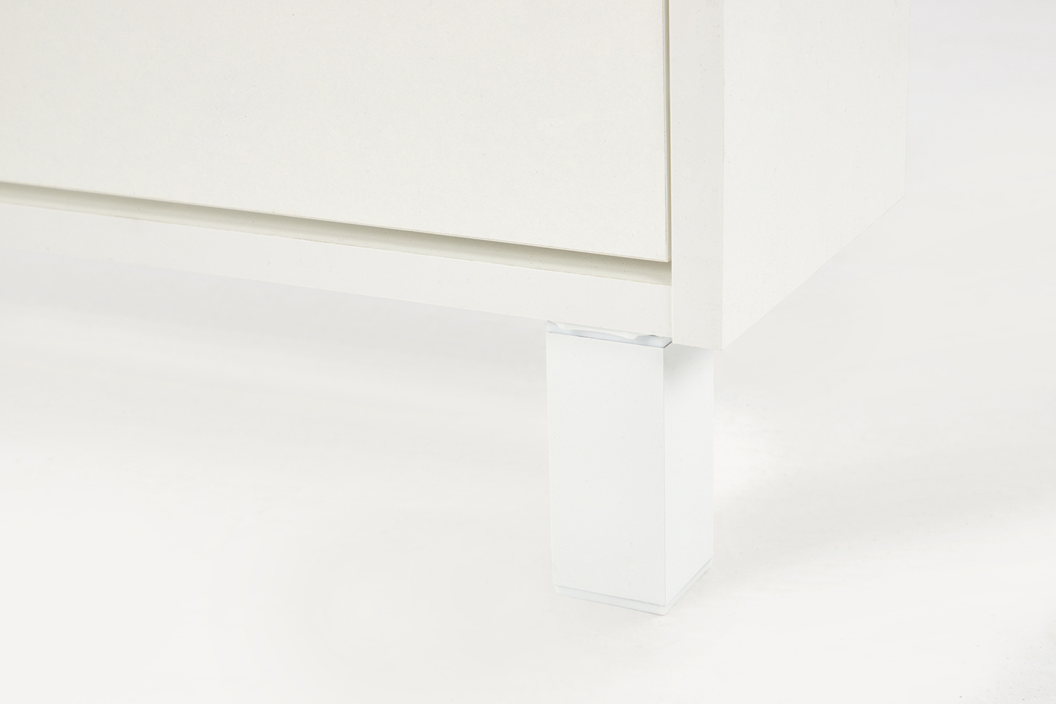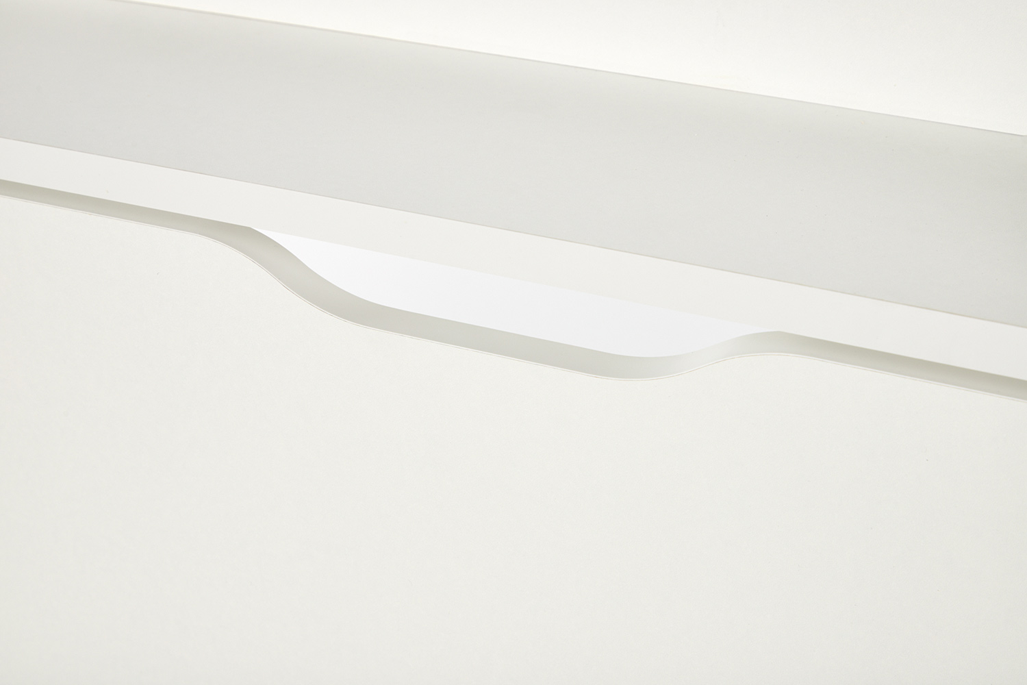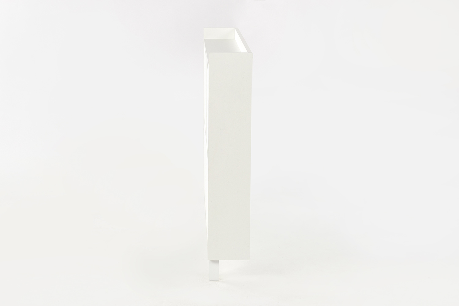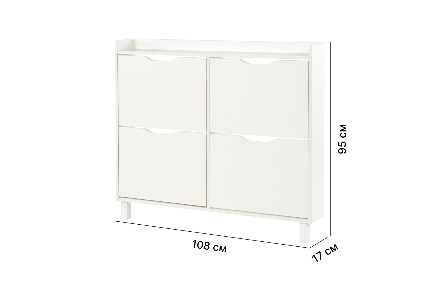 Обувница разделена на 4 независимые секции с откидным механизмом открывания. Каждая из них вмещает по 4 пары невысокой обуви. Вместо мебельных ручек на фасадах предусмотрены специальные выемки для захвата.