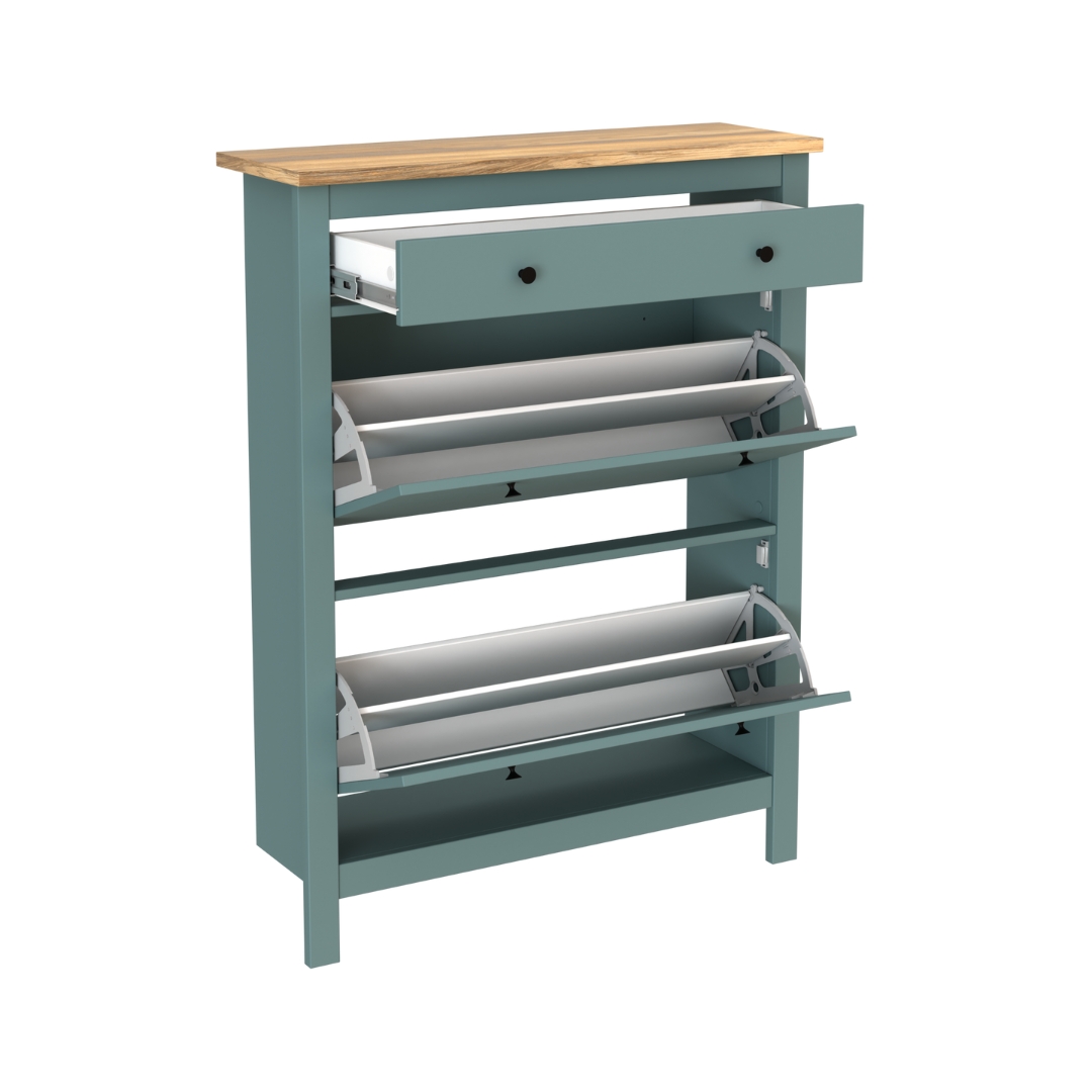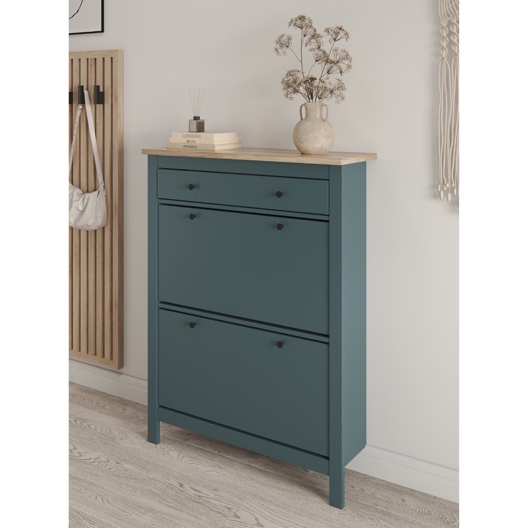 У обувницы имеется один выдвижной ящик для различный мелочей и два отсека для обуви — идеальное решение для компактной прихожей. Галошница оснащена надежными магнитными фиксаторами, которые обеспечивают безопасность и предотвращает случайное падение полки. Вы можете быть уверены, что обувь останется на своем месте.