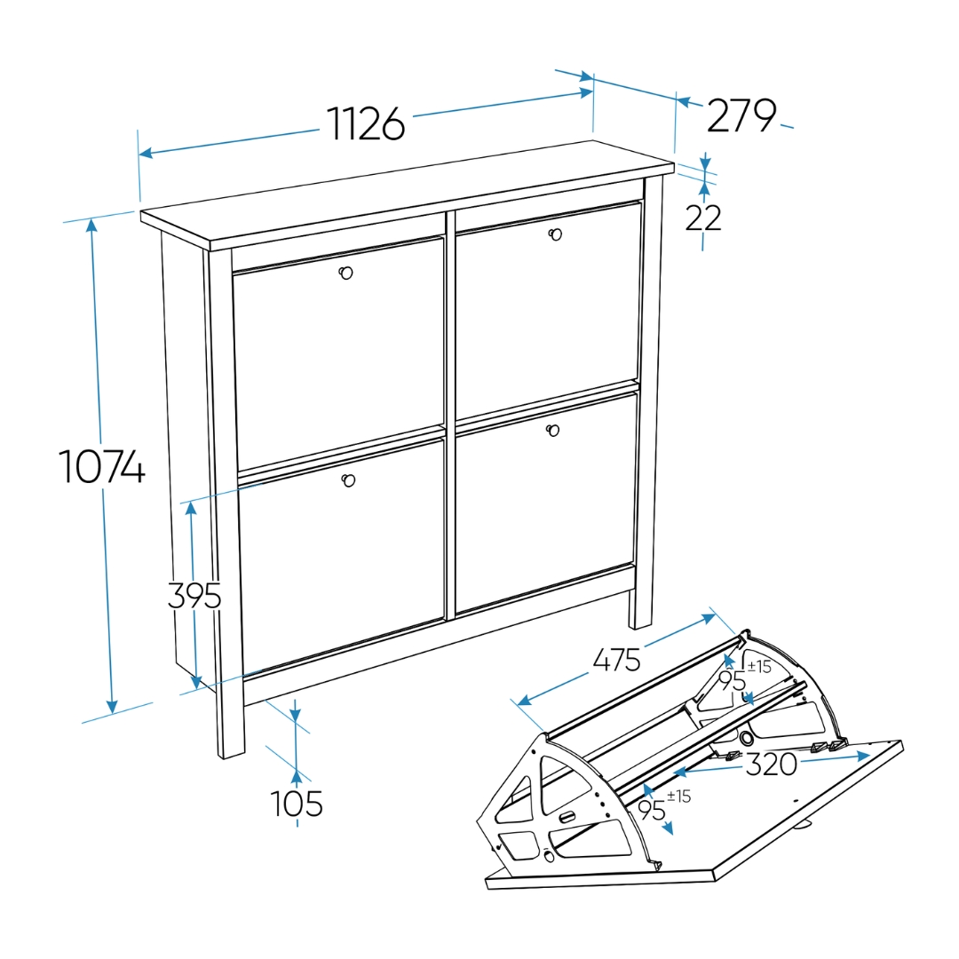 Главная особенность тумбы — четыре откидывающихся полки, на которых можно с комфортом разместить до двенадцати пар обуви. Это позволяет легко доставать и убирать обувь, сохраняя ее в идеальном состоянии. Обувница оснащена надежными магнитными фиксаторами, которые обеспечивают безопасность и предотвращает случайное падение полки. Вы можете быть уверены, что обувь останется на своем месте.