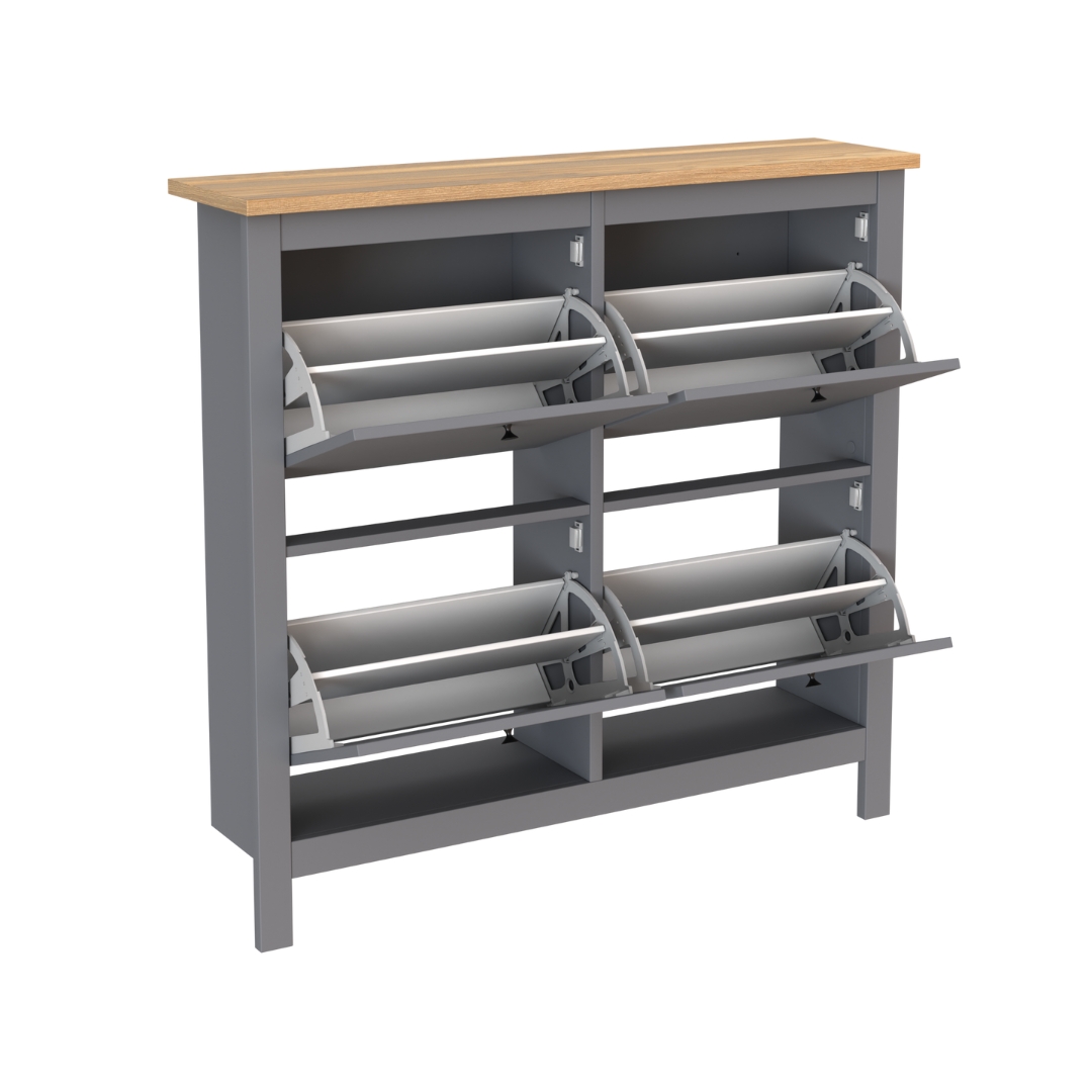 Главная особенность тумбы — четыре откидывающихся полки, на которых можно с комфортом разместить до двенадцати пар обуви. Это позволяет легко доставать и убирать обувь, сохраняя ее в идеальном состоянии. Обувница оснащена надежными магнитными фиксаторами, которые обеспечивают безопасность и предотвращает случайное падение полки. Вы можете быть уверены, что обувь останется на своем месте.