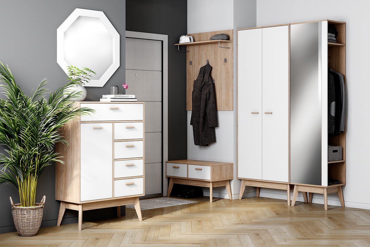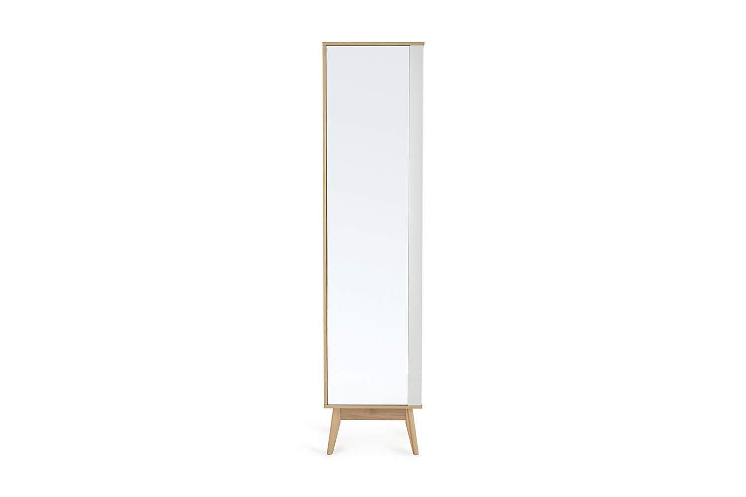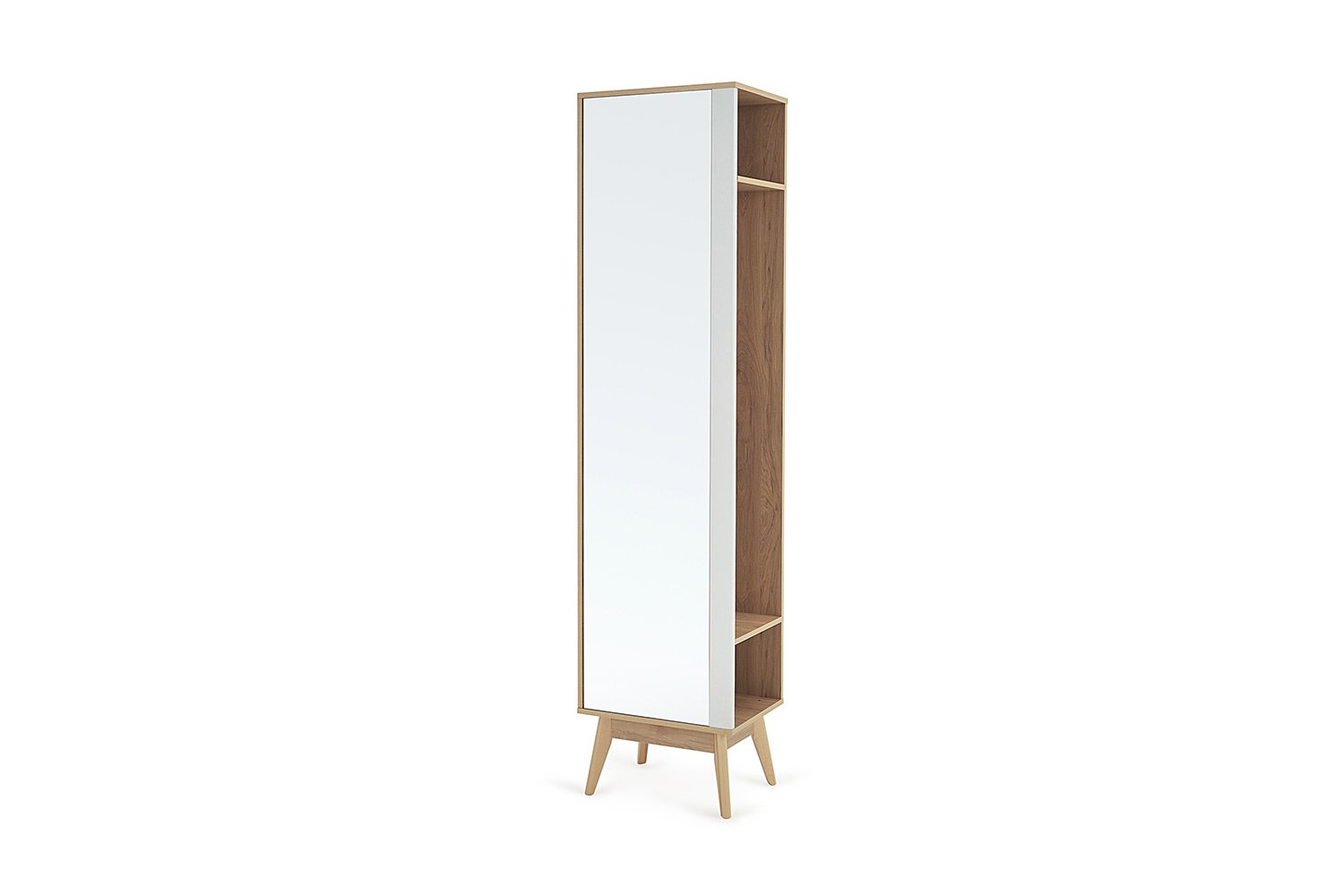 Шкаф с зеркалом Хортен – находка для небольшой прихожей. Модель не имеет распашной дверцы, поэтому можно не резервировать дополнительное пространство для ее открывания. Доступ к хранящимся вещам осуществляется сбоку, где отсутствует торцевая стенка. Внутреннее наполнение стандартное: продольная штанга, пара полок – антресольная и образующая нишу для обуви или сумок. Закрепленное на фасаде зеркальное полотно высотой 181,8 см позволяет увидеть свое отражение в полный рост. Корпус выполнен в отделке, имитирующей древесину дуба. В светлом декоре, дизайне расставленных под углом опор ощущается влияние скандинавского стиля и эстетики mid-century modern.