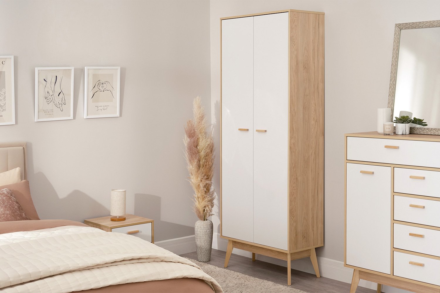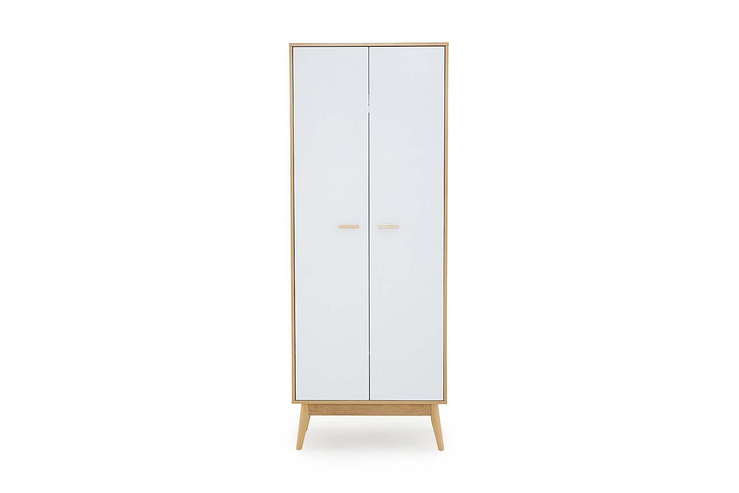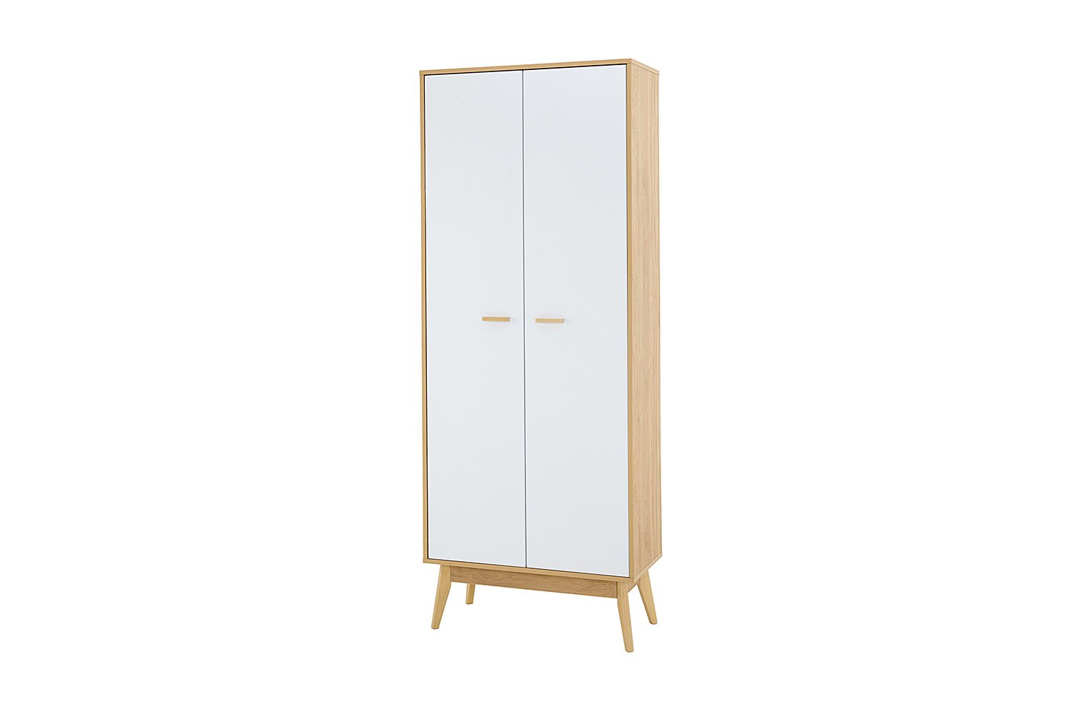 Шкаф "Калгари" для прихожей - это высокий, достаточно узкий и в то же время вместительный гардероб с выдвижной штангой для одежды на плечиках, белоснежными дверцами из МДФ и корпусом из ЛДСП цвета натурального дуба, который хорошо впишется в вашу прихожую, выполненный в модном скандинавском стиле.