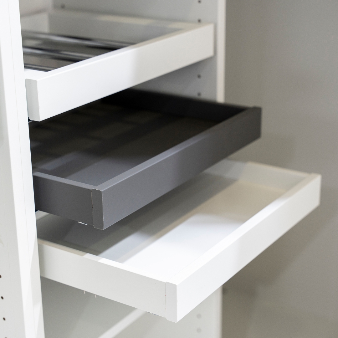 Выдвижная полка МАКС значительно расширит возможности хранения ремней, галстуков различных мелочей и даже обуви.