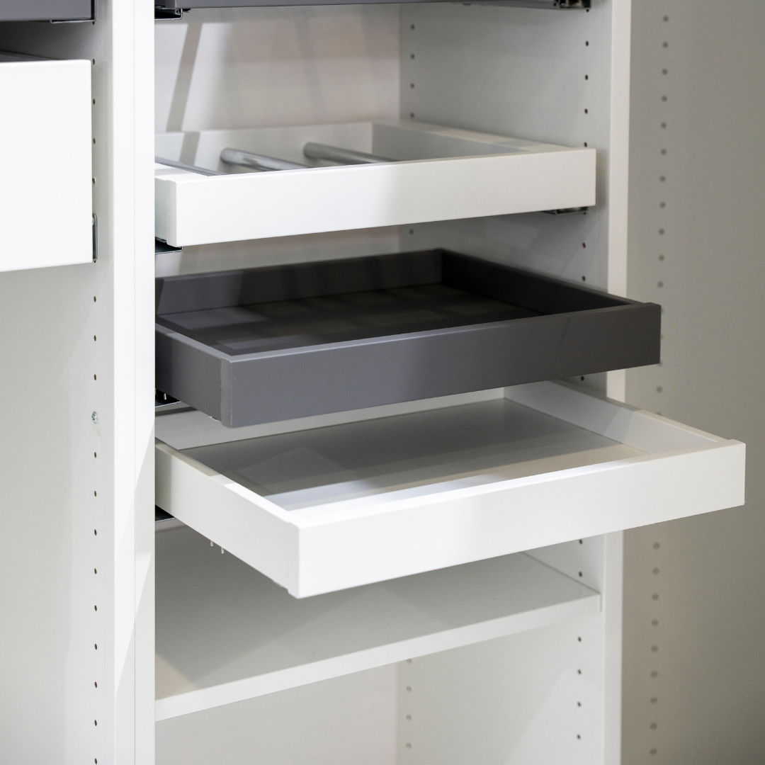 Выдвижная полка МАКС значительно расширит возможности хранения ремней, галстуков различных мелочей и даже обуви.