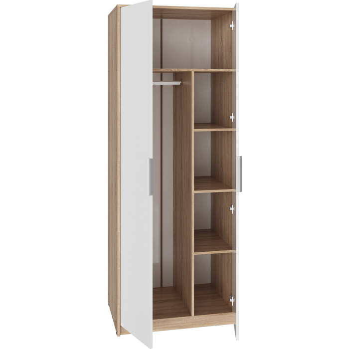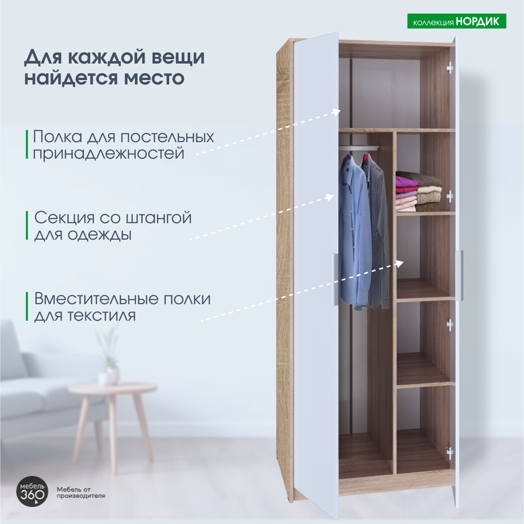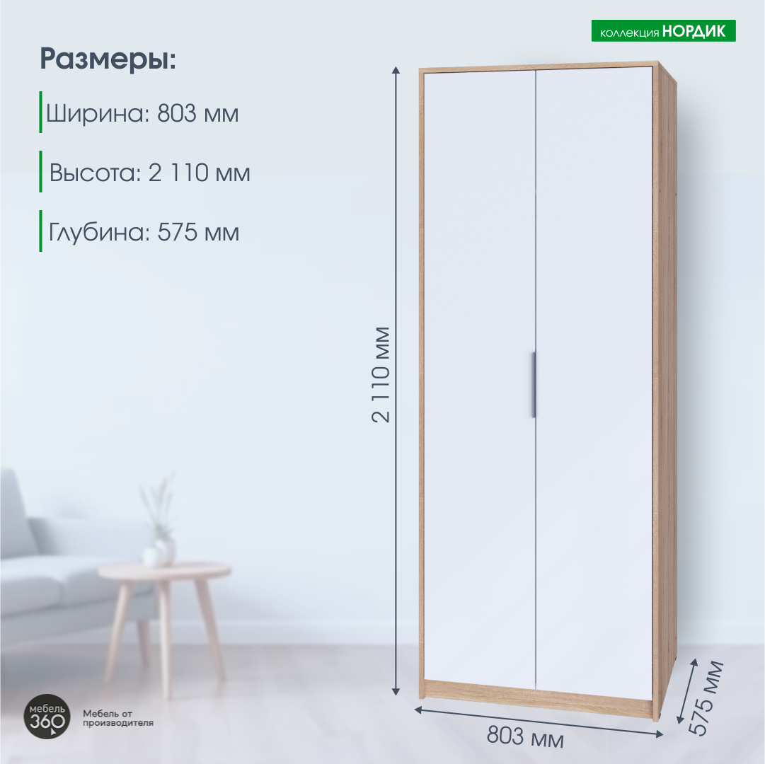 Шкаф 2-дверный NORDIC - удобная и практичная система хранения вещей в прихожей, детской или гостиной. Сочетание декоров натурального дерева и белого цвета подчеркнет современный стиль Вашего интерьера. Шкаф удачно впишется даже в небольшую квартиру благодаря своей компактности и зрительной легкости.