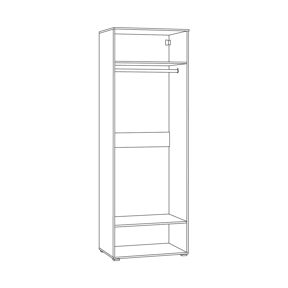 За двумя глухими дверцами шкафа находится штанга для плечиков, антресольная полка и нижняя полка.