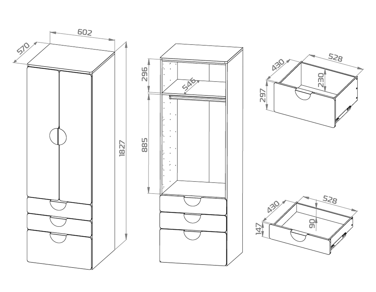 Внутреннее наполнение включает штангу для одежды, верхнюю полку и три выдвижных ящика, обеспечивая удобное размещение всех необходимых вещей.