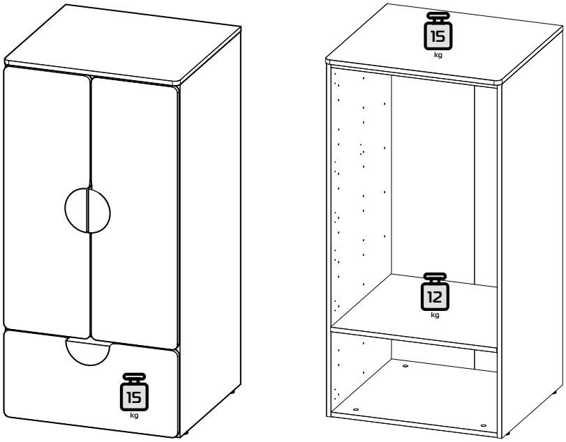Максимальная нагрузка (кг): на полку - 12, на ящик - 15.
