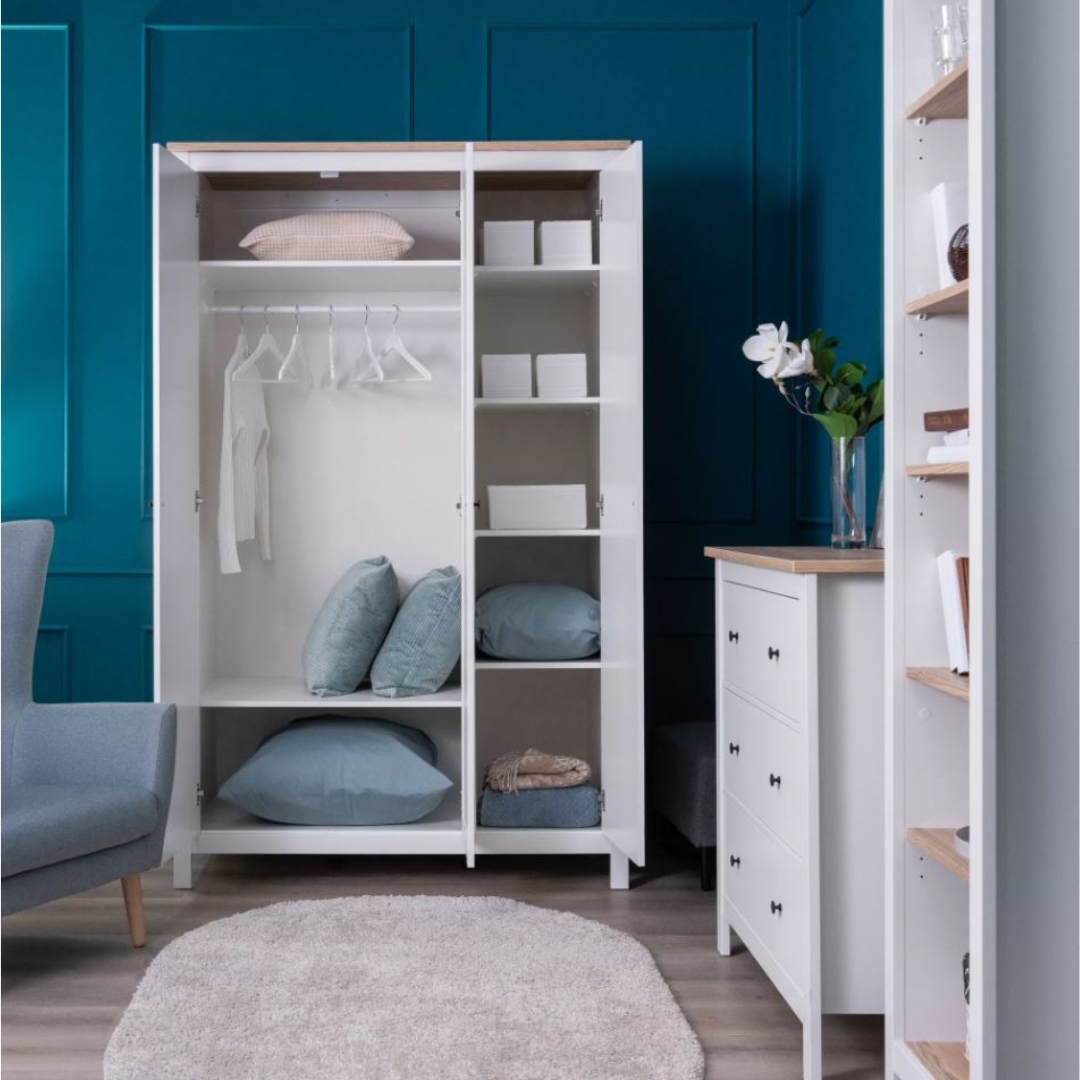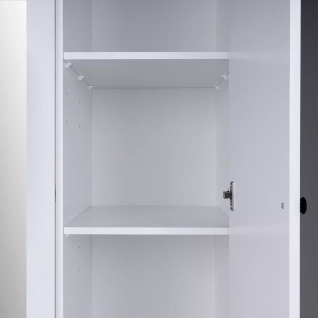 Шкаф САГА оснащен 6 регулируемыми полками, что позволяет гибко организовать пространство внутри шкафа в зависимости от ваших потребностей. Также для удобного размещения одежды на плечиках предусмотрена платяная штанга.