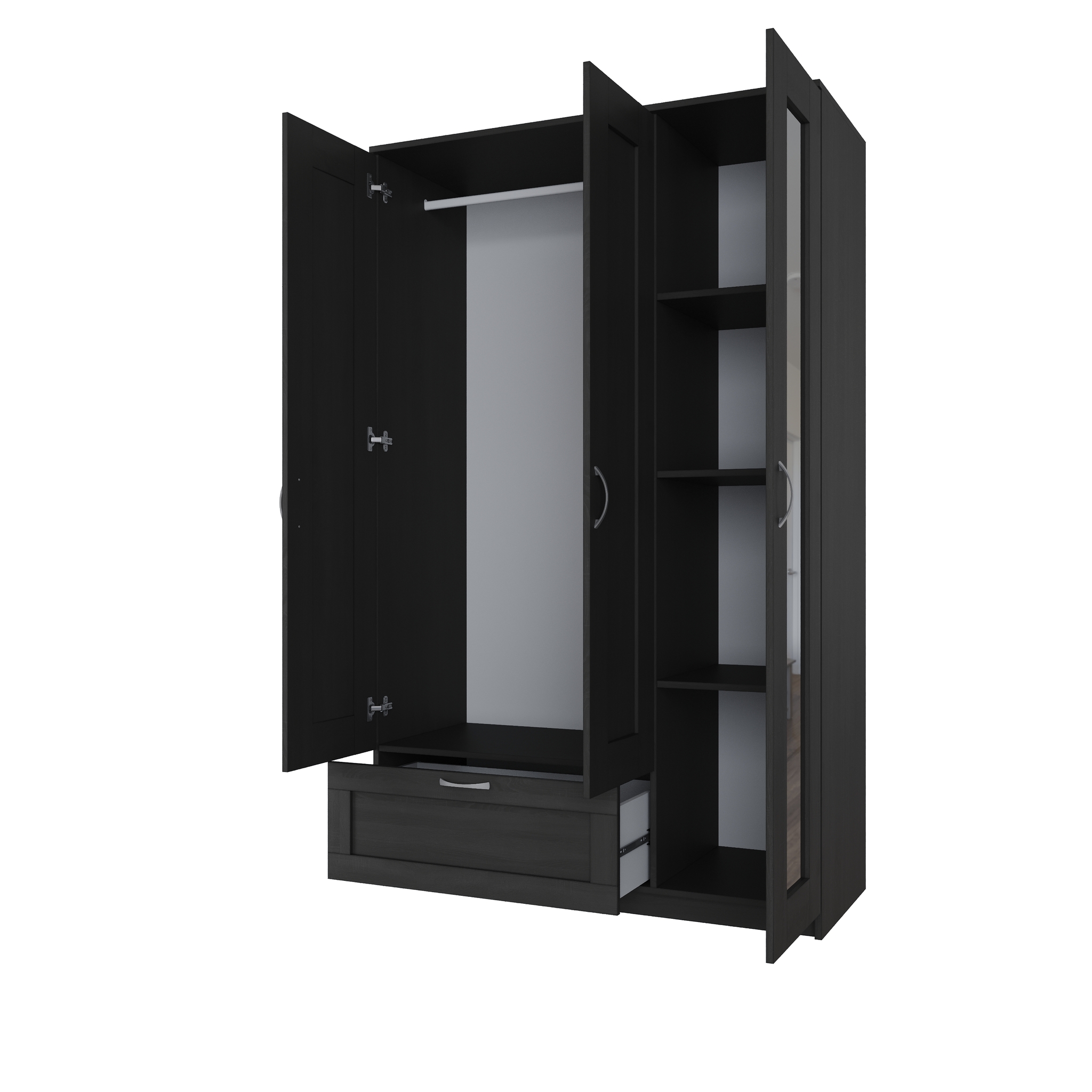 Шкаф оснащен вместительной штангой и полками, что делает его идеальным для хранения платьев и другой одежды. Распашные двери обеспечивают легкий доступ ко всем вещам, а отдельный ящик предоставляет дополнительное пространство для мелочей.