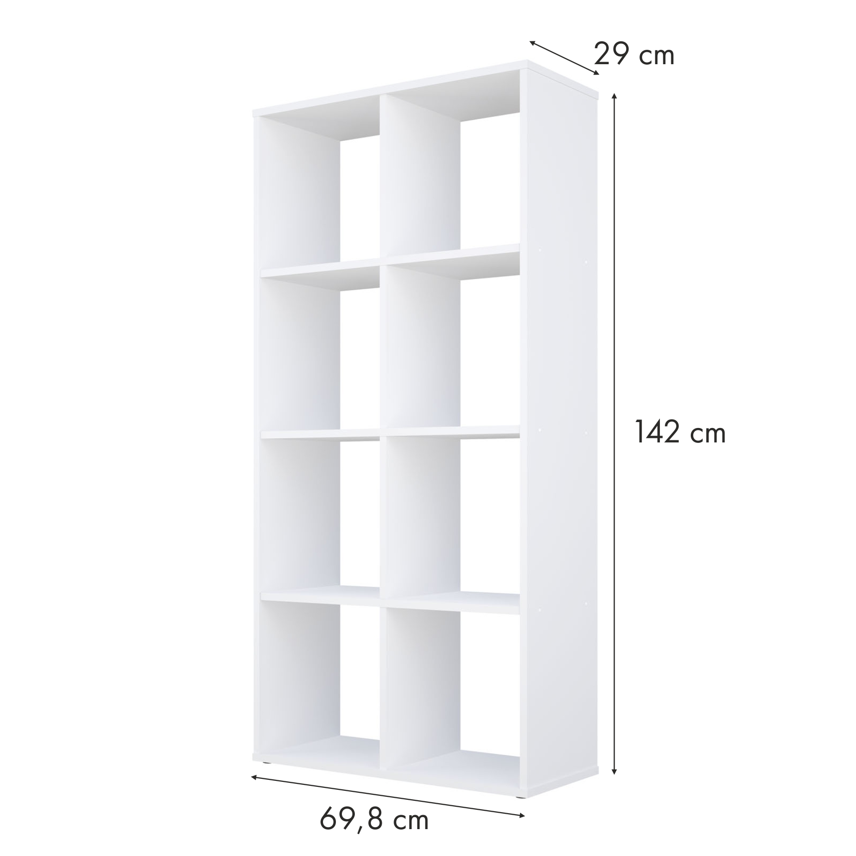 Габариты изделия (ВхШхГ): 142 х 69,8 х 29 см. Внутренний размер 1 полки (ВхШхГ):33,5 х 32,3 х 28 см.