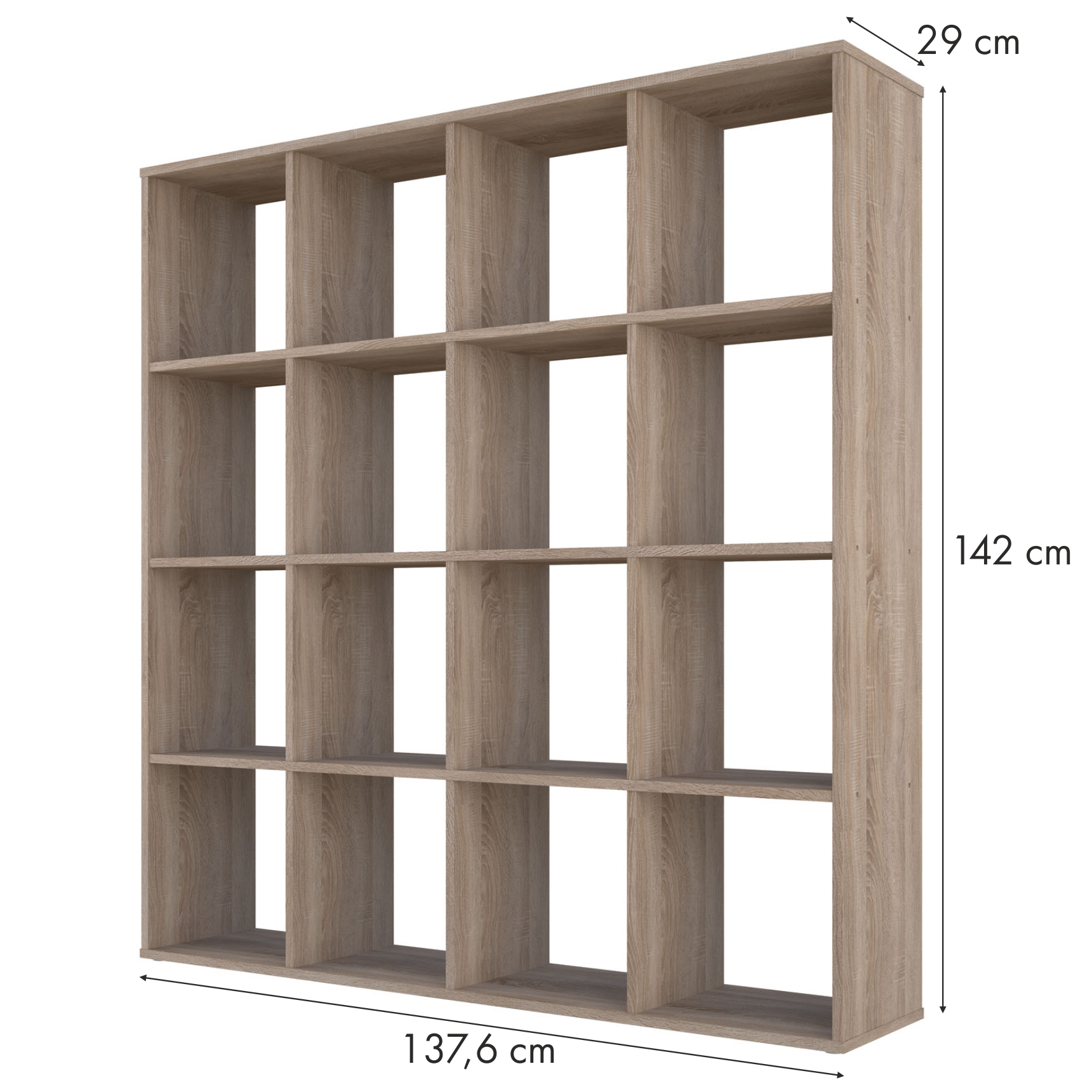 Габариты изделия (ВхШхГ):142х 137,6 х 29 см. Внутренний размер 1 полки (ВхШхГ):33,5 х 32,3 х 28 см.