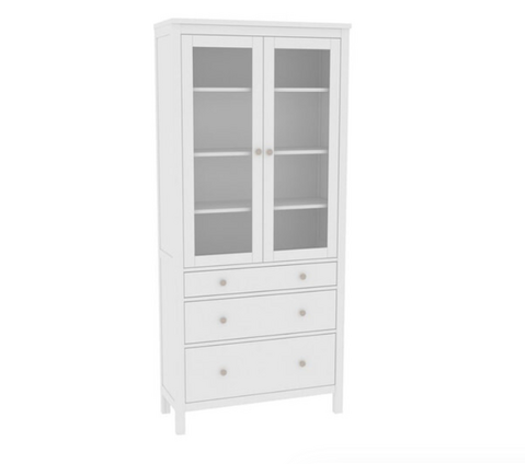 Двухдверный шкаф с тремя полками за остеклёнными дверями и тремя выдвижными ящиками для различных столовых предметов.