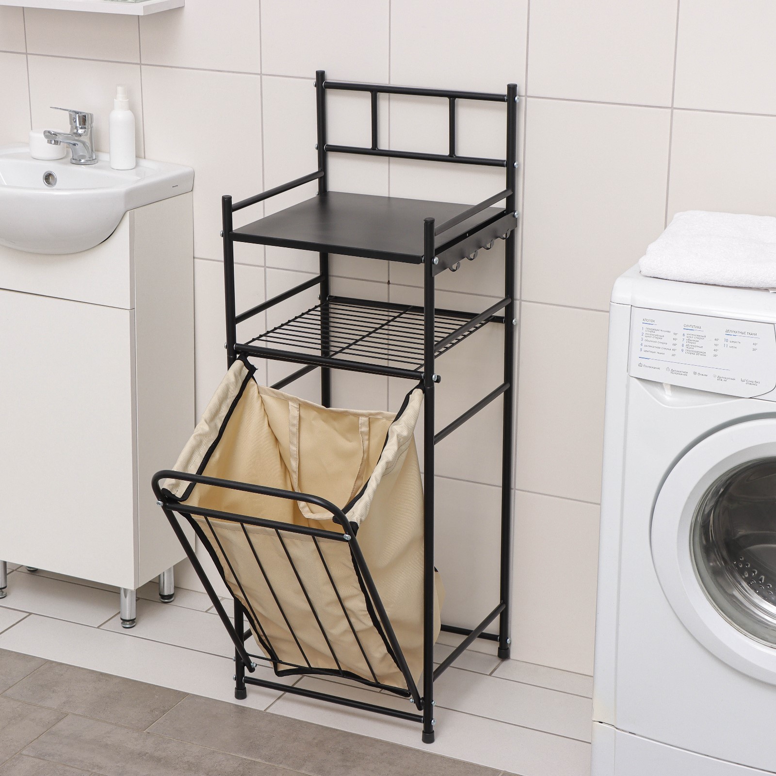 Стеллаж с корзиной для белья станет прекрасным дополнением вашего интерьера и поможет эргономично организовать пространство.