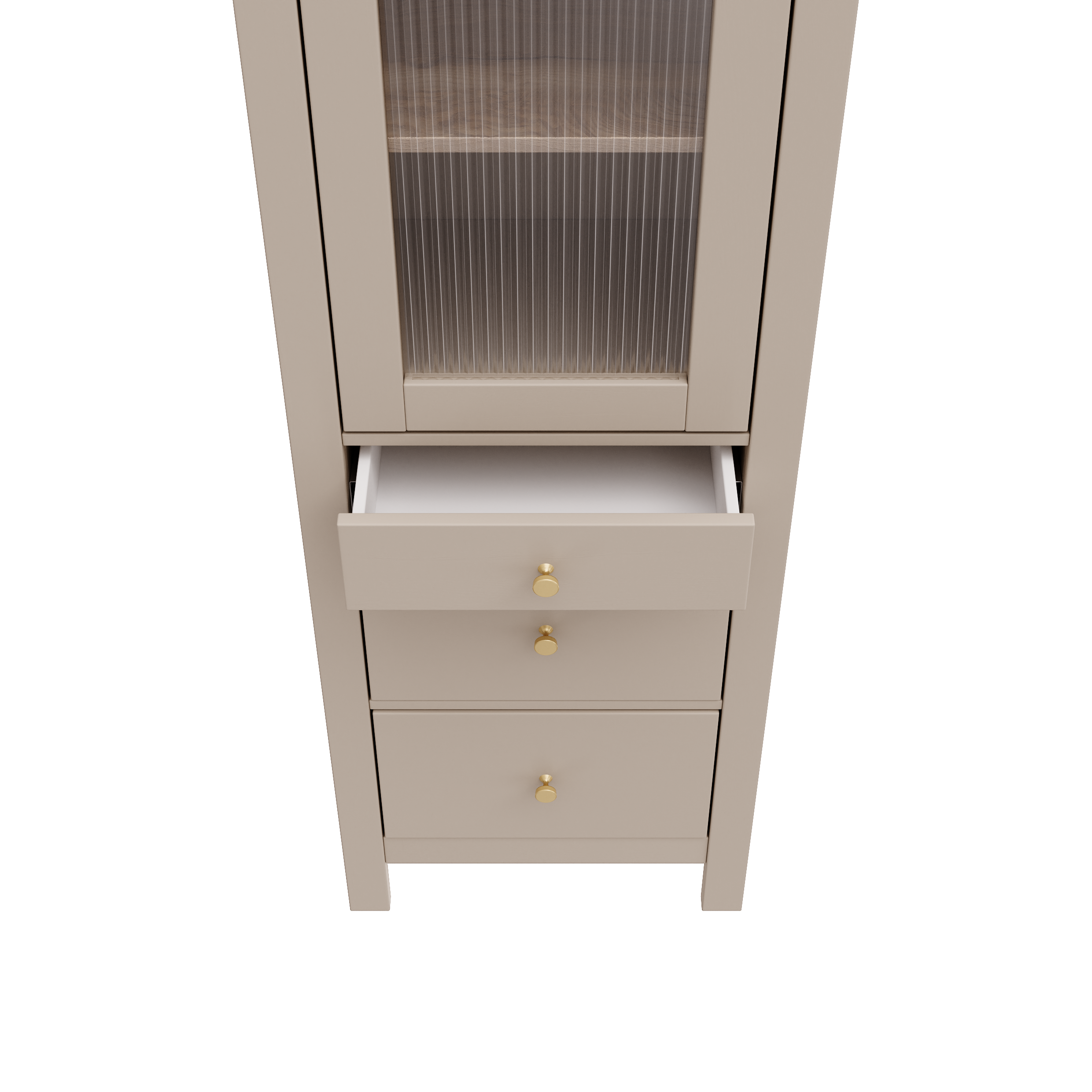 Шкаф-витрина САГА оснащена 3 вместительными полками, которые можно отрегулировать по высоте, а также 3 выдвижными ящиками. Это позволяет гибко организовать пространство для хранения.