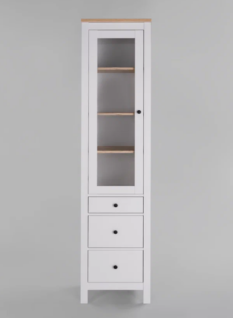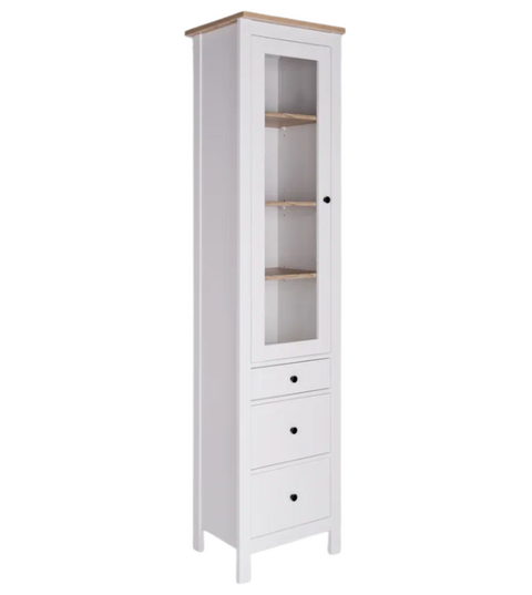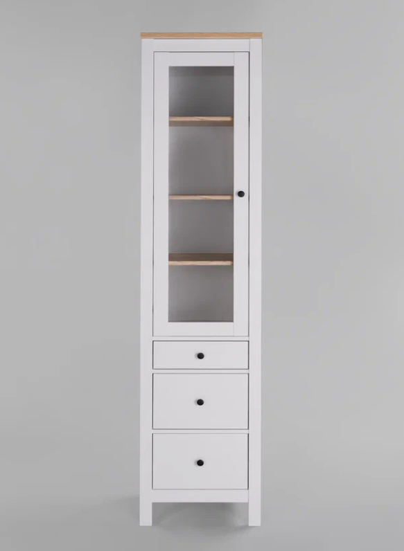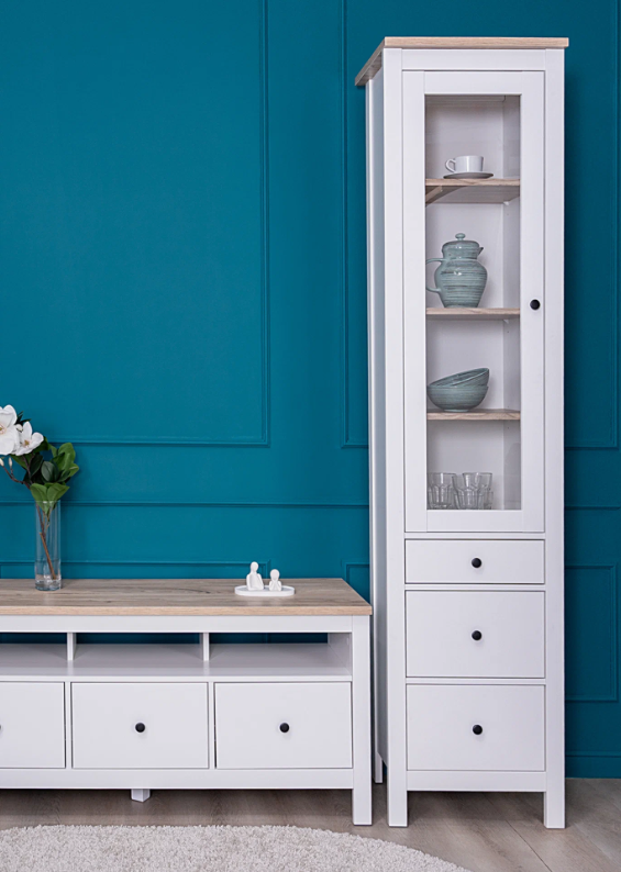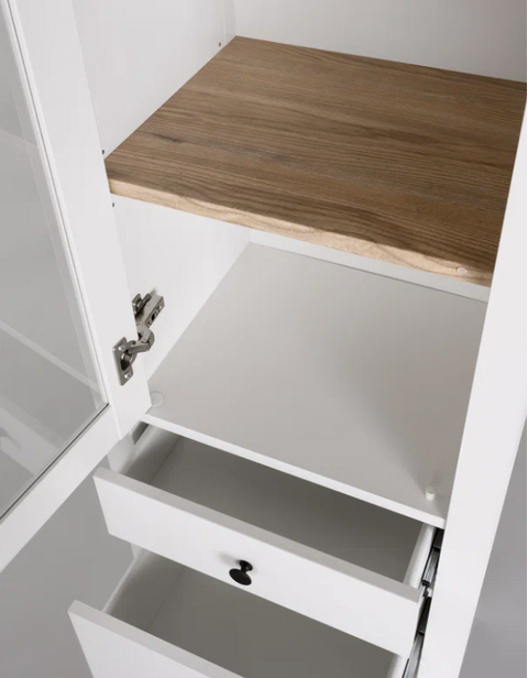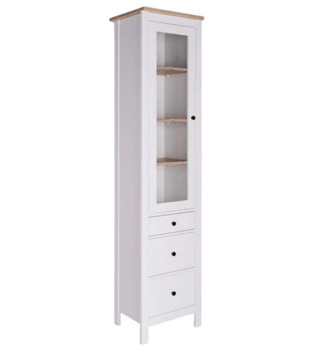 Шкаф-витрина САГА оснащена 3 вместительными полками, которые можно отрегулировать по высоте, а также 3 выдвижными ящиками. Это позволяет гибко организовать пространство для хранения.