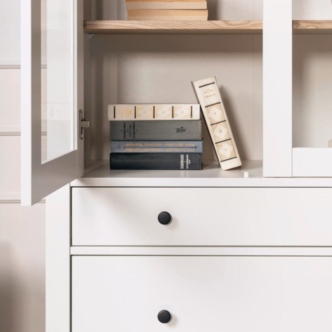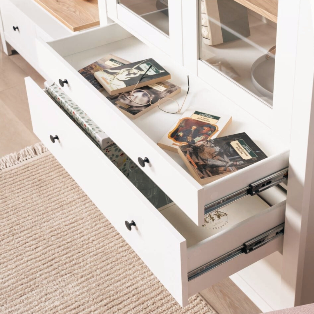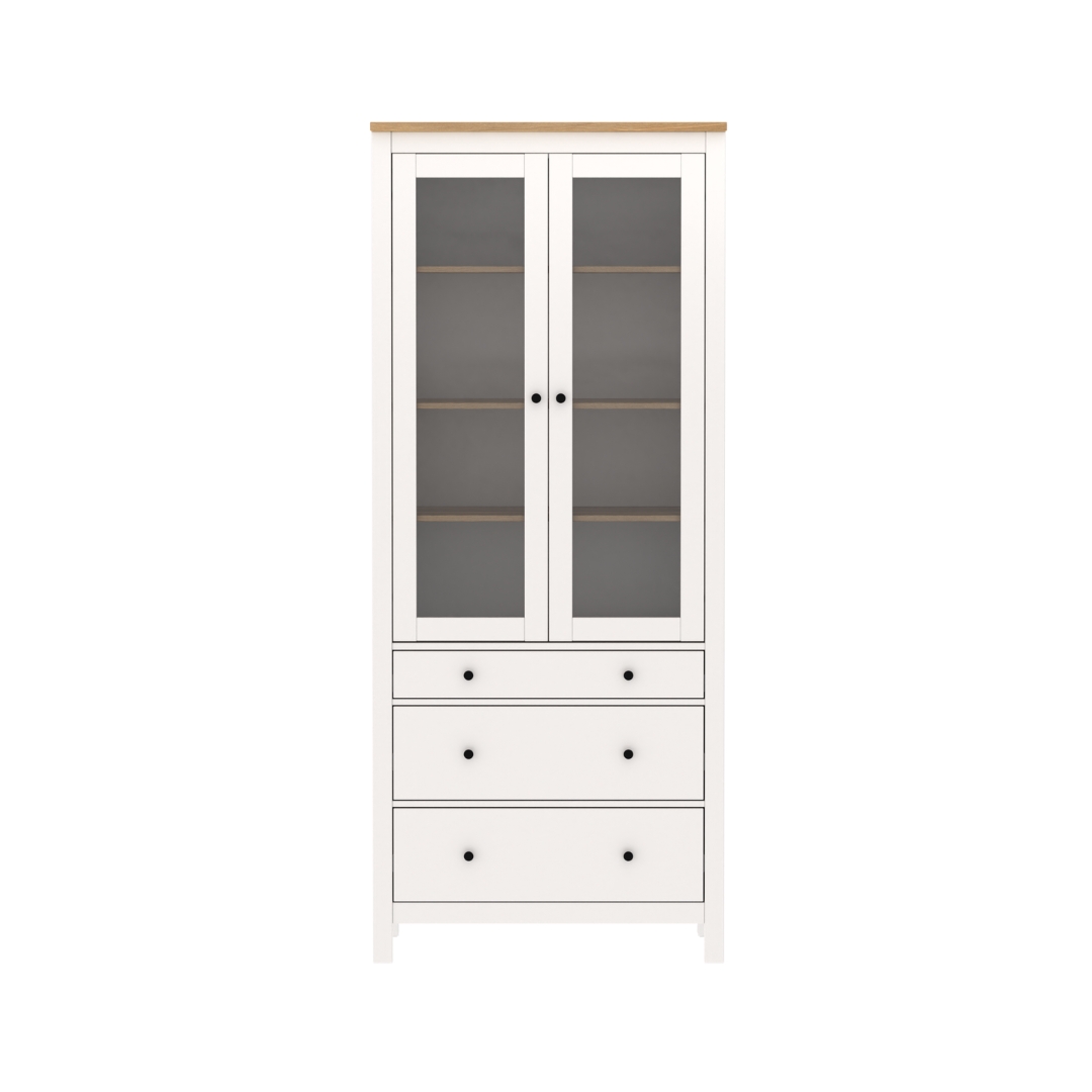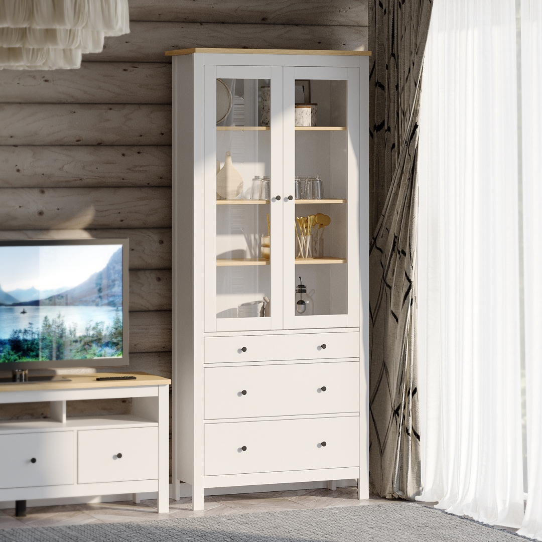 Шкаф-витрина САГА оснащена 3 вместительными полками, которые можно отрегулировать по высоте, а также 3 выдвижными ящиками. Это позволяет гибко организовать пространство для хранения.