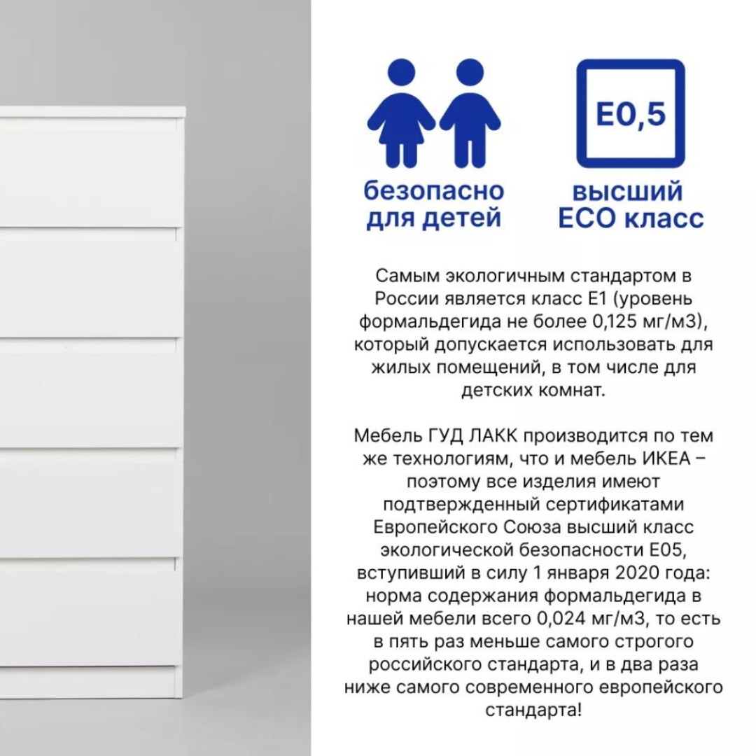 Мебель ГУД ЛАКК производится на заводе полного цикла по принципу «от древесины до готового изделия». Применяются максимально жесткие требования к экологичности на уровне, установленном для детской мебели (класс эмиссии Е0,5);