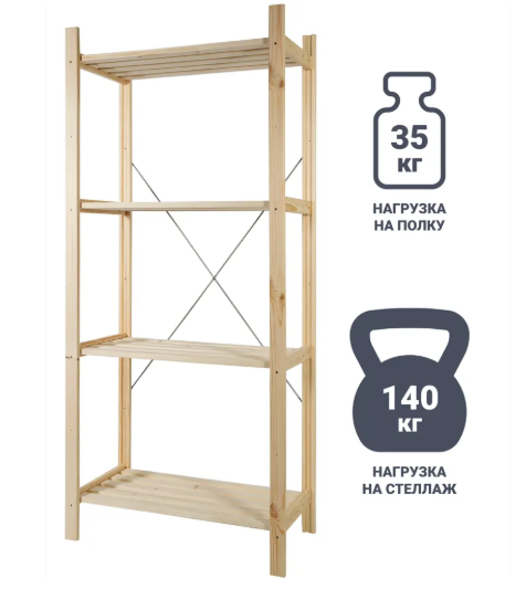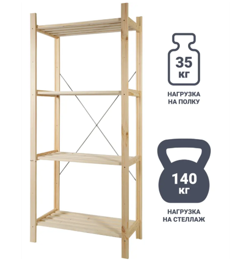 Стеллаж состоит из четырех полок размером 69 × 34 см. Общая высота конструкции — 155 см.
