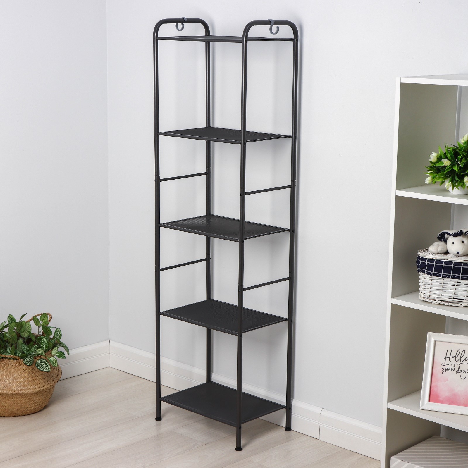 Система хранения имеет 5 металлических сетчатых полок, каждая из которых выдерживает нагрузку до 8 кг.