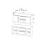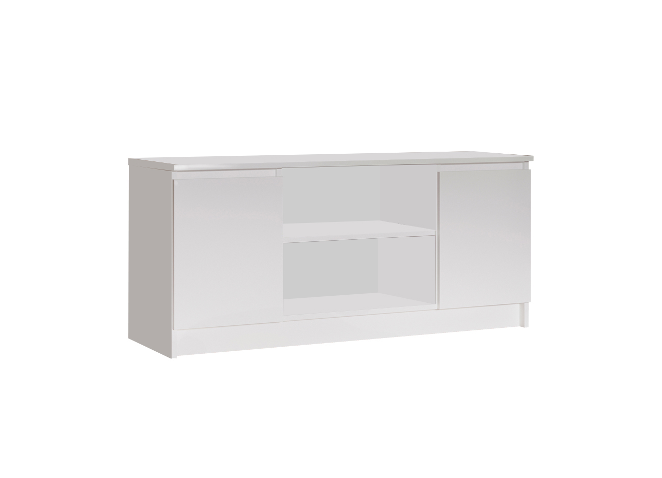 Тумба под ТВ небольшая, но функциональная. Состоит из открытой центральной части с полкой на полкодержателях, по краям находятся закрытые части. На створках-фасада отсутствуют ручки, функцию ручек выполняют сами фасады. Открытие створок производится за счет пространства между планками и фасадами, внутри расположены полки на полкодержателях.