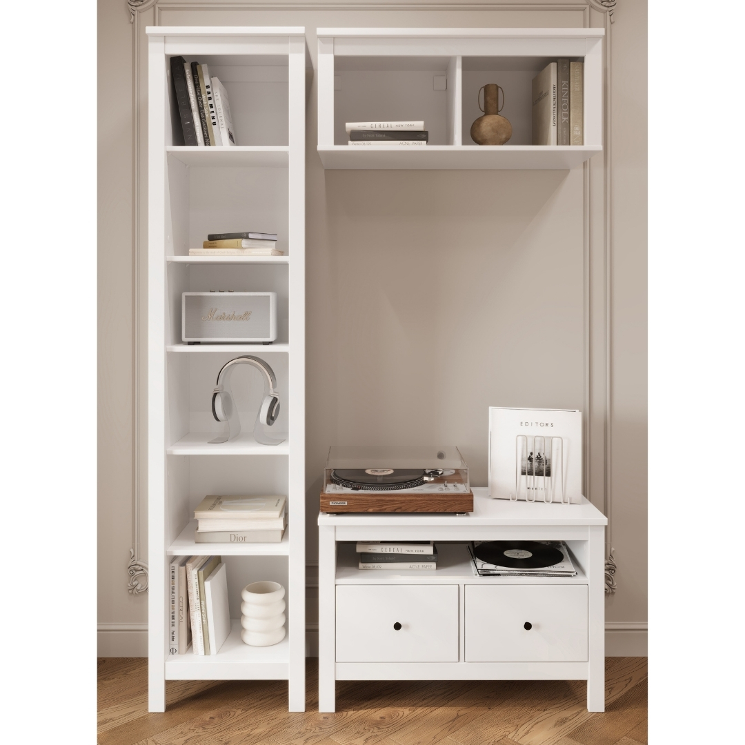 Тумба САГА, 2 ящика, 91х62 см — это стильное и функциональное решение для организации медиацентра, которое идеально сочетает в себе практичность, элегантный дизайн и продуманные детали. Её ключевая особенность — открытая полка без задней стенки, разработанная специально для размещения игровых консолей, таких как Play Station, или другой техники, требующей эффективной вентиляции. Эта полка также позволяет удобно вывести кабели, сохраняя пространство аккуратным и организованным.