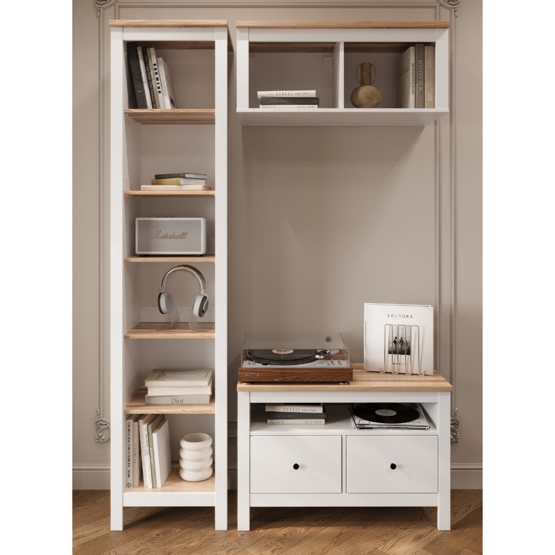 Тумба САГА, 2 ящика, 91х62 см — это стильное и функциональное решение для организации медиацентра, которое идеально сочетает в себе практичность, элегантный дизайн и продуманные детали. Её ключевая особенность — открытая полка без задней стенки, разработанная специально для размещения игровых консолей, таких как Play Station, или другой техники, требующей эффективной вентиляции. Эта полка также позволяет удобно вывести кабели, сохраняя пространство аккуратным и организованным.