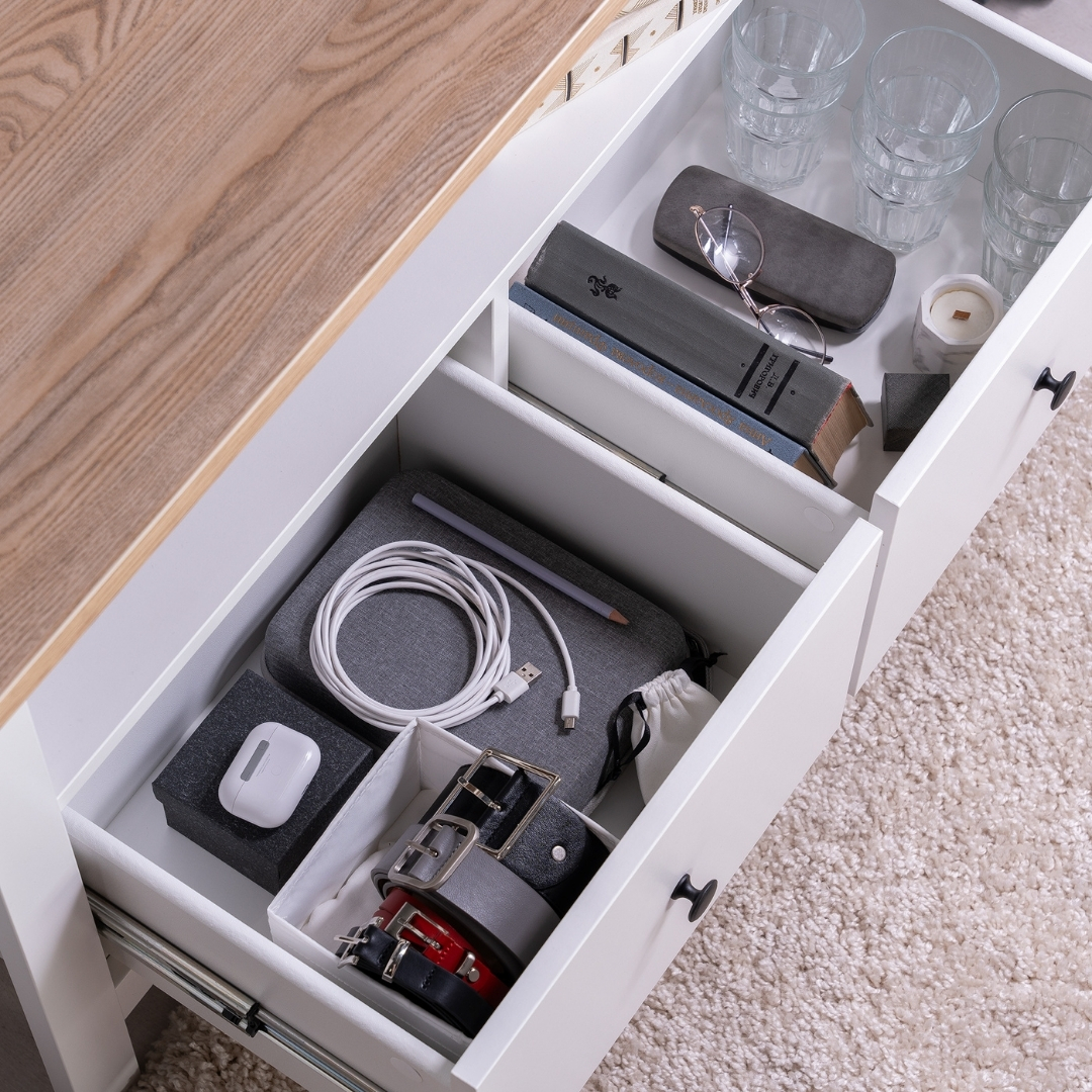 Тумба оснащена двумя просторными ящиками. Ящики оборудованы современными направляющими полного выдвижения с доводчиками, которые обеспечивают плавное, бесшумное и легкое открывание, добавляя комфорта в повседневное использование. Все части тумбы под ТВ, подверженные нагрузке, изготовлены из прочного МДФ, что гарантирует устойчивость и долговечность даже при активном использовании.