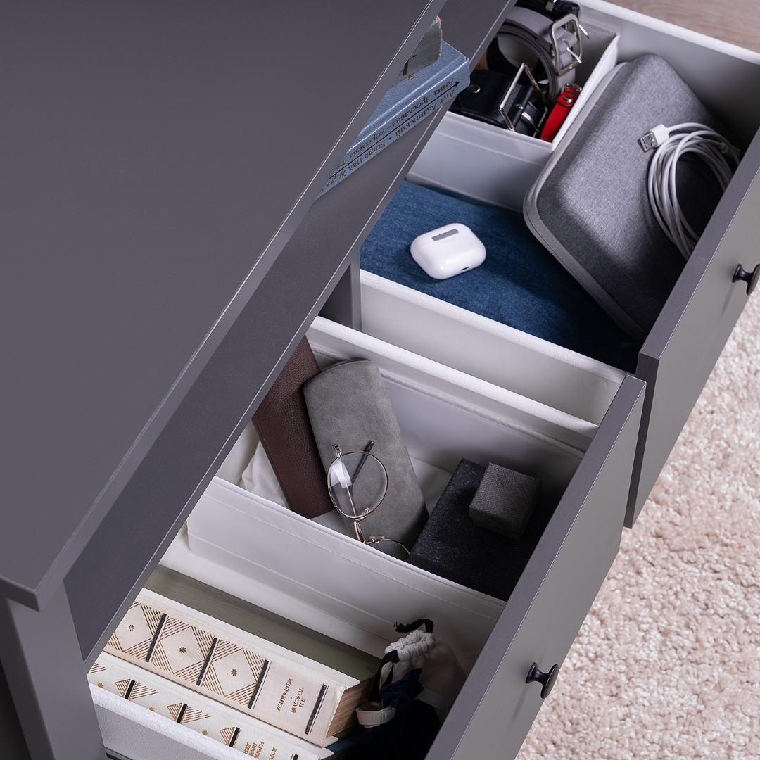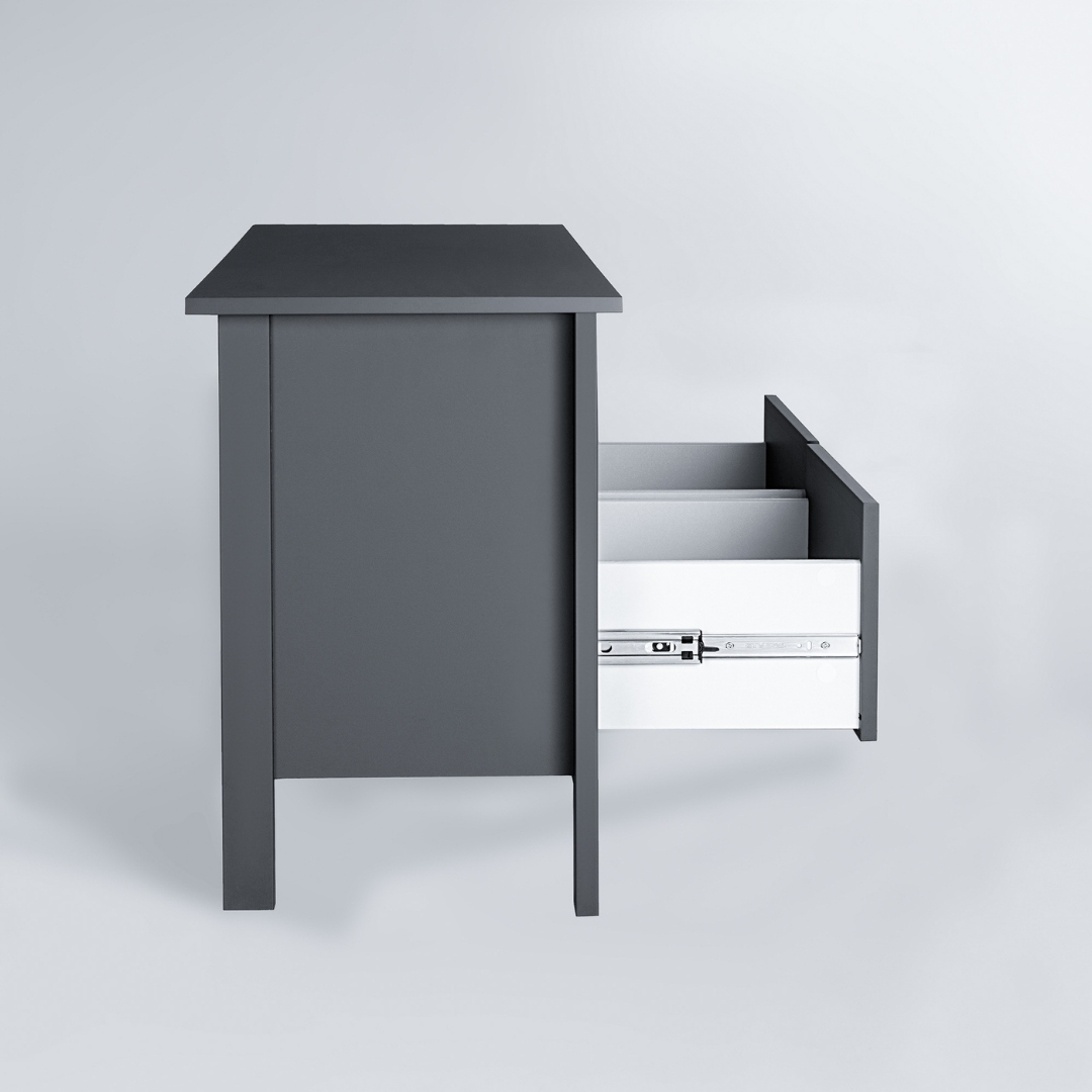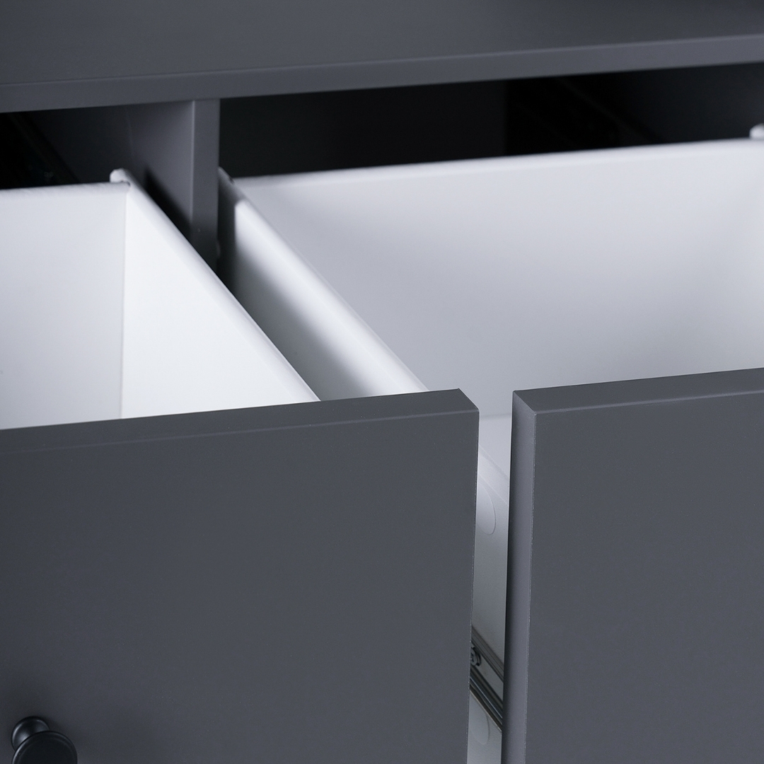 Тумба оснащена двумя просторными ящиками. Ящики оборудованы современными направляющими полного выдвижения с доводчиками, которые обеспечивают плавное, бесшумное и легкое открывание, добавляя комфорта в повседневное использование. Все части тумбы под ТВ, подверженные нагрузке, изготовлены из прочного МДФ, что гарантирует устойчивость и долговечность даже при активном использовании.