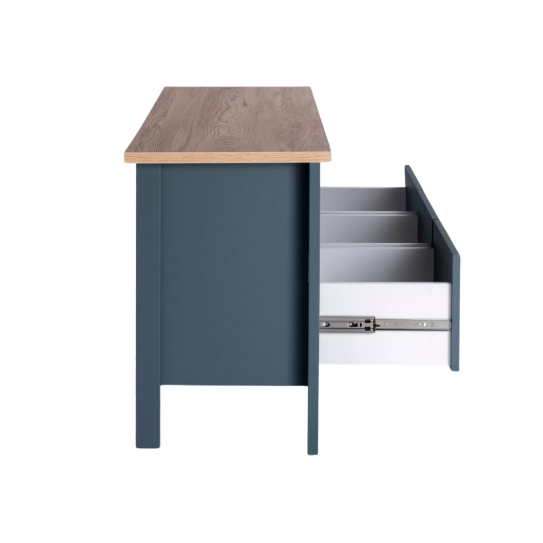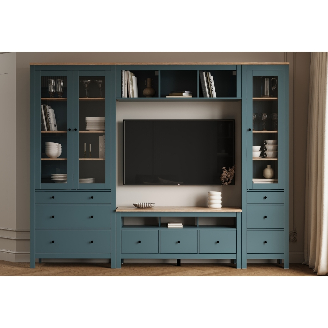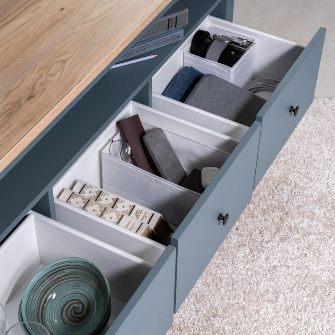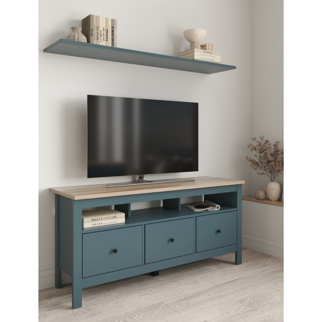 Тумба САГА, 3 ящика, 131х62 см — это стильное и функциональное решение для организации медиацентра, которое идеально сочетает в себе практичность, элегантный дизайн и продуманные детали. Её ключевая особенность — открытая полка без задней стенки, разработанная специально для размещения игровых консолей, таких как Play Station, или другой техники, требующей эффективной вентиляции. Эта полка также позволяет удобно вывести кабели, сохраняя пространство аккуратным и организованным.