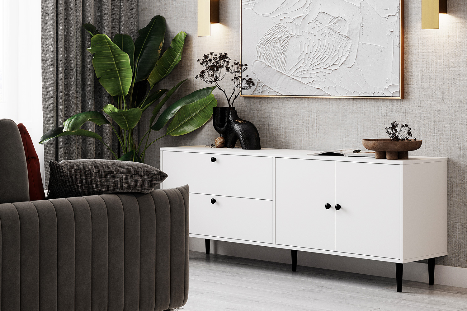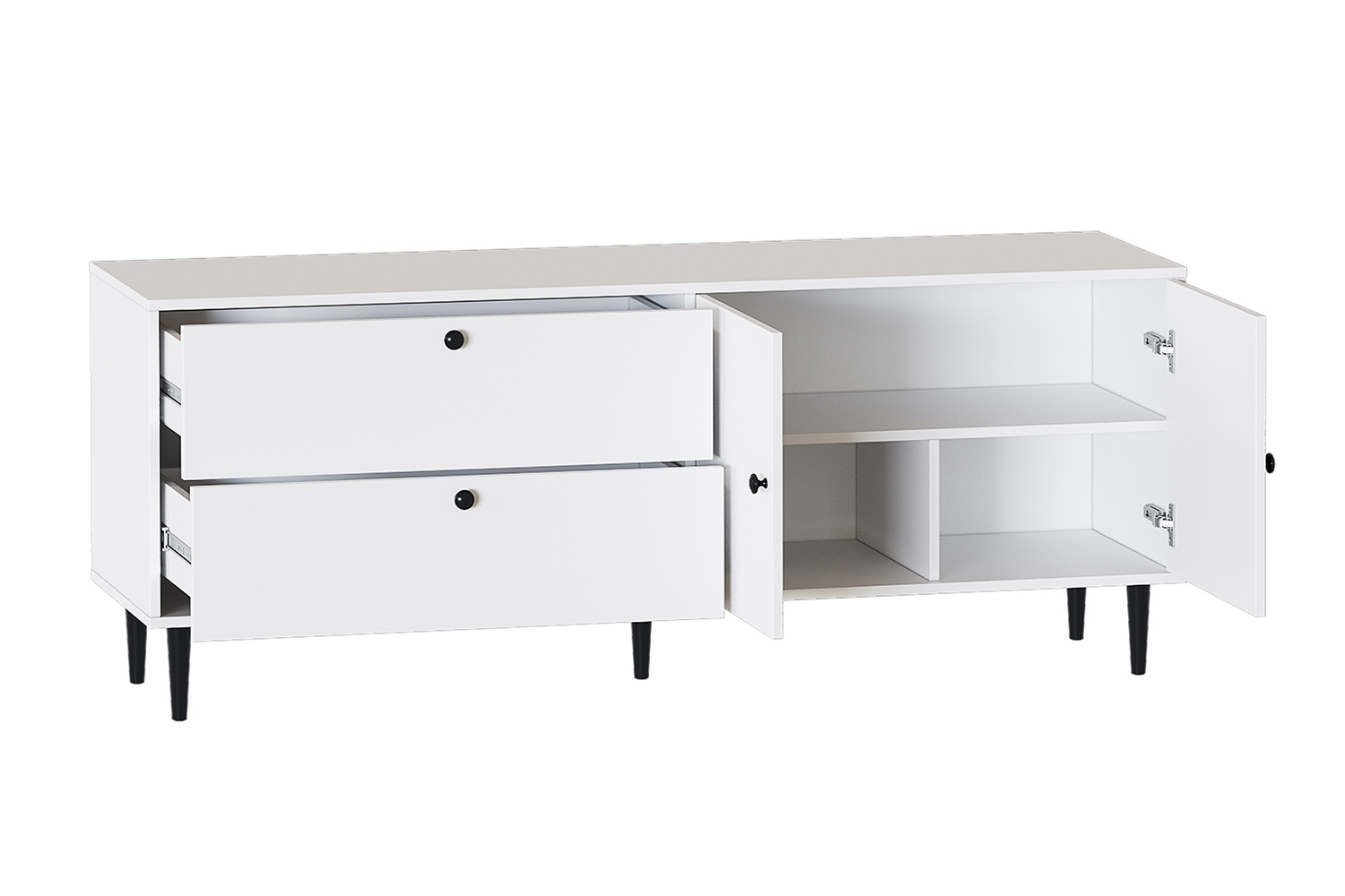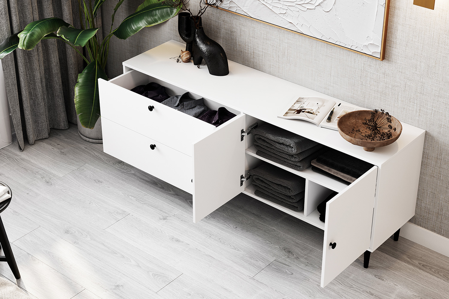 Широкий тумба SCANDICA Виго с ящиками полного выдвижения и тремя отделениями за распашными дверцами — универсальная модель для хранения аксессуаров, гаджетов, документов, техники и домашних мелочей.