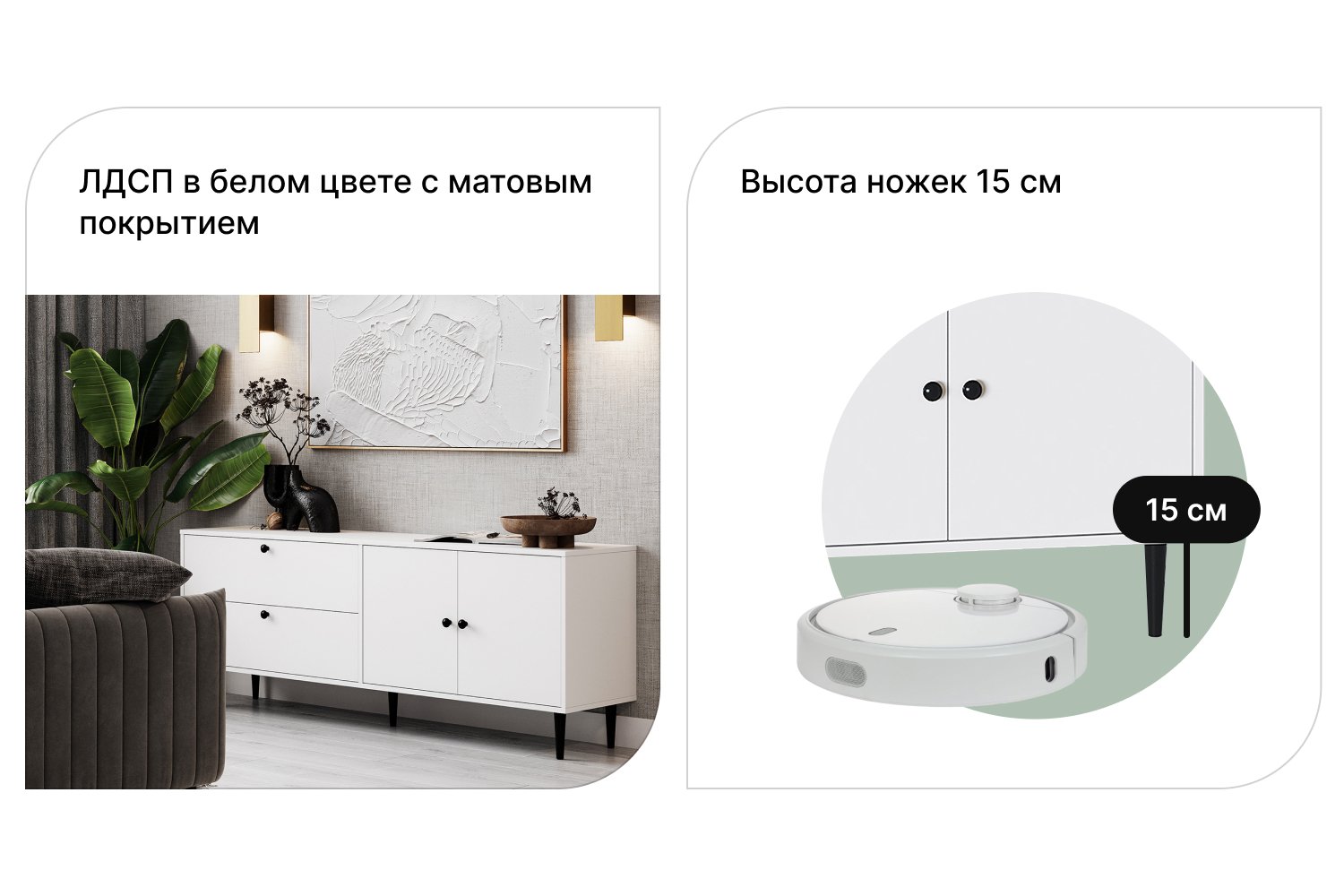 Белизну корпуса подчеркивают контрастные черные ручки, а стройные ножки придают изделию визуальную легкость.
