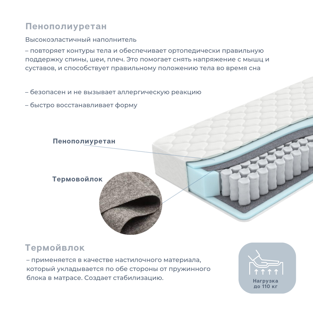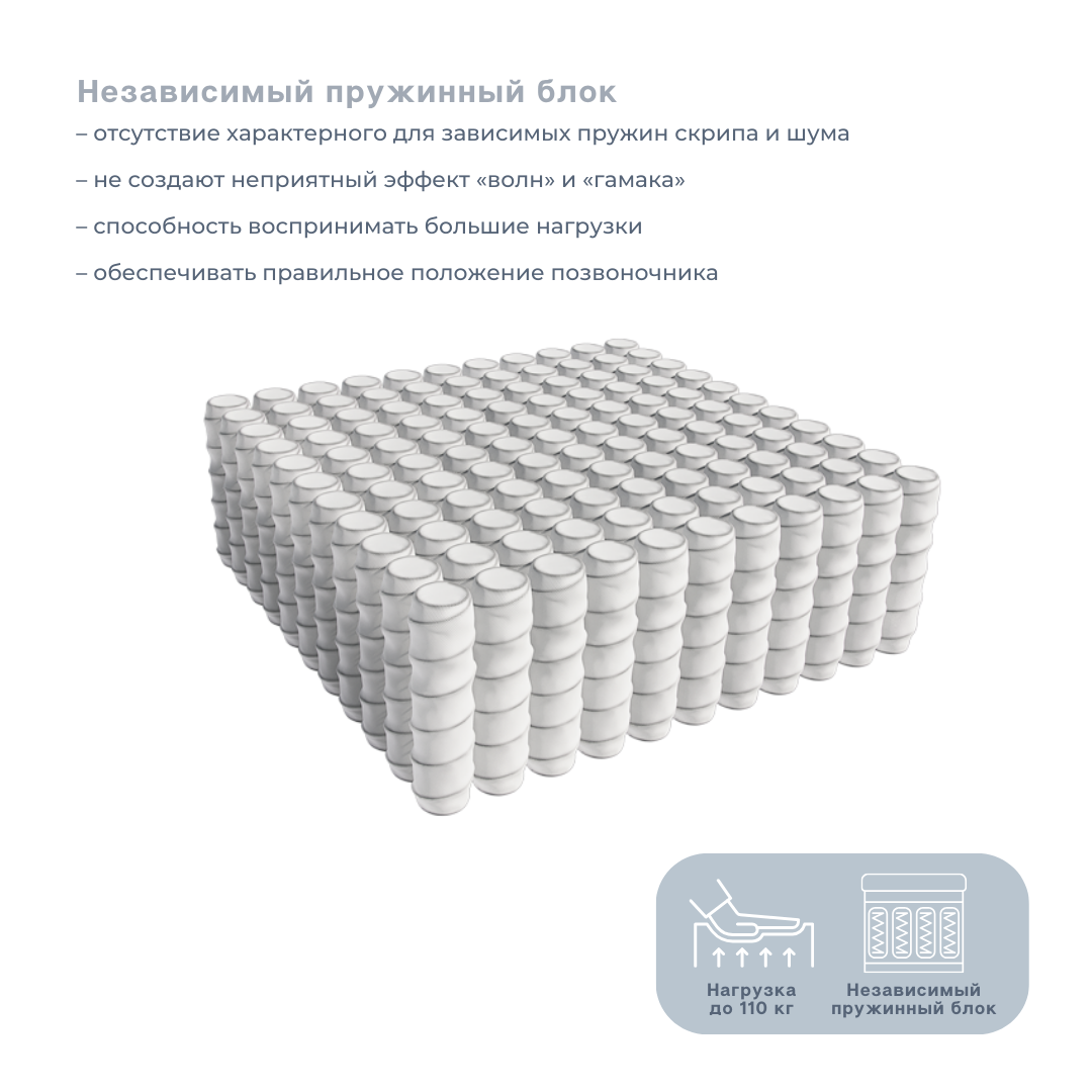 Равномерно распределяют нагрузку по всей горизонтальной поверхности, совершенно не скрипят. Каждая часть вашего тела получает необходимую поддержку. Независимо от веса спящих на разных половинках матраса, каждый спит с правильным положением позвоночника.