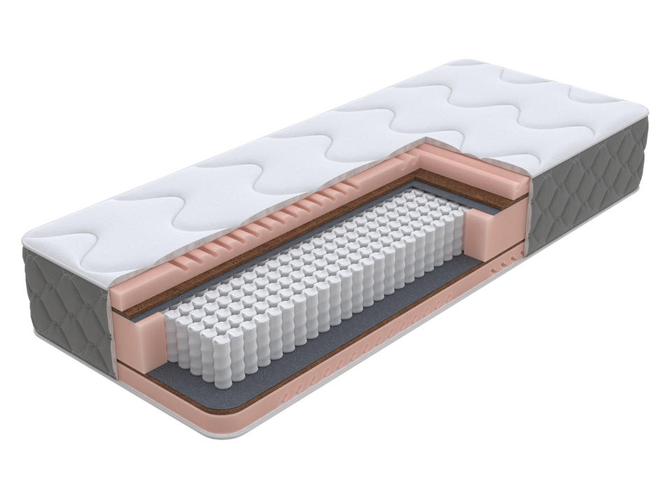 Умеренно-жесткий матрас с невероятным уровнем комфорта, который создают сочетание натуральной кокосовой койры и современного пенного материала Ортофом с зональной резкой. Высокое качество поддержки обеспечивает блок c 1000 пружин на спальное место. Он равномерно распределяет нагрузку по всей горизонтальной поверхности матраса и поддерживает позвоночник в правильном положении во время сна. Современный чехол из белоснежного трикотажа в сочетании с мебельным бурлетом серого цвета создает дополнительный комфорт и придает матрасу прекрасный внешний вид.