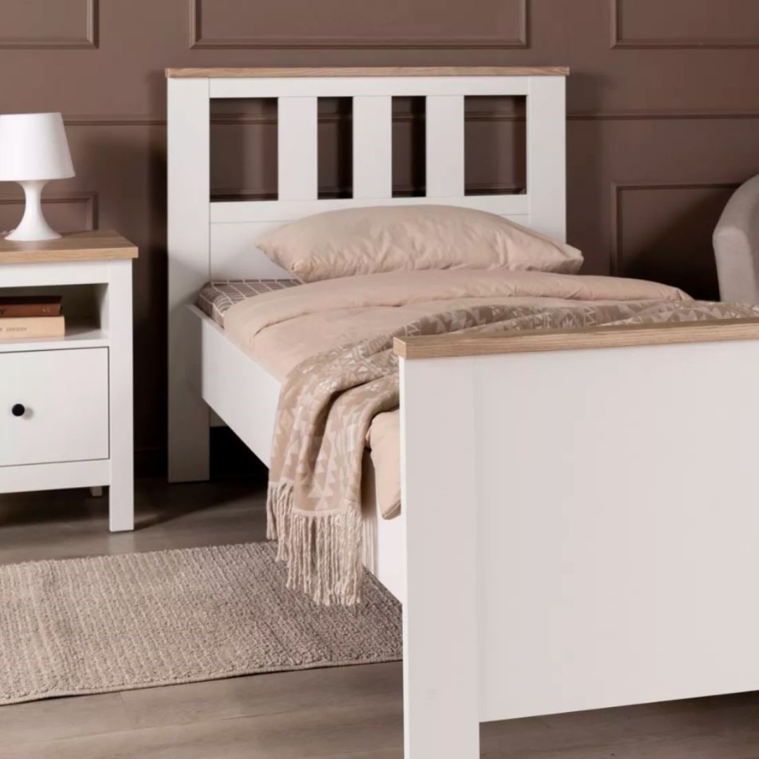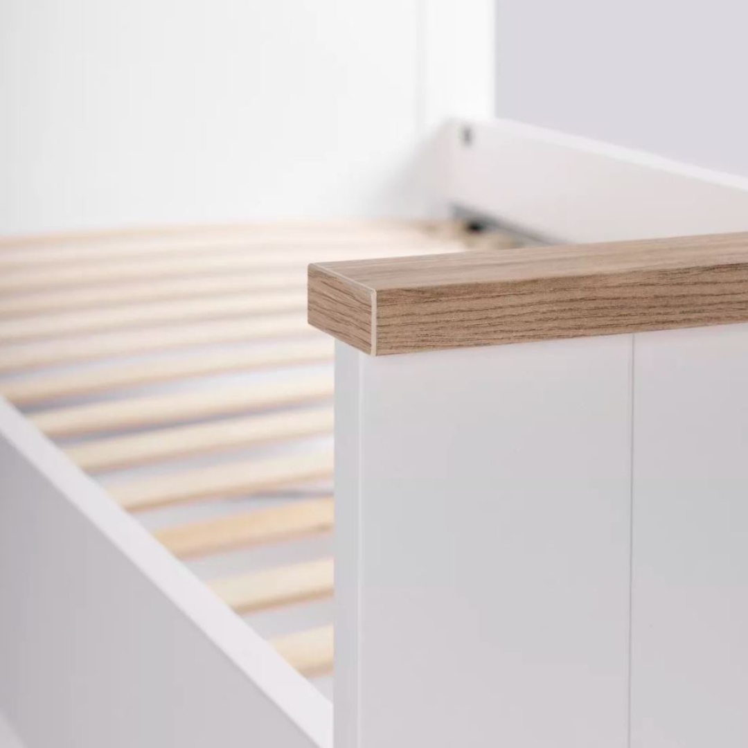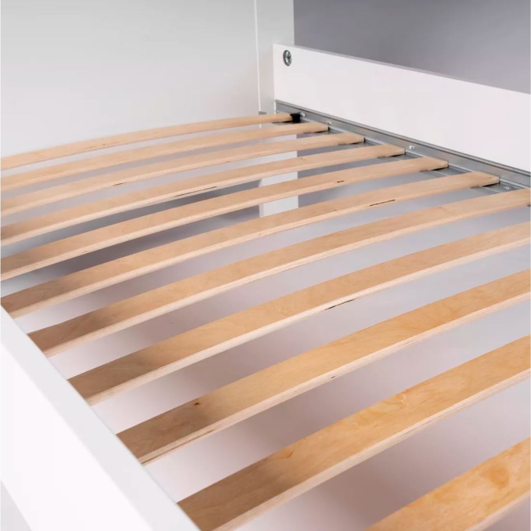 Оснащена ортопедическим реечным дном, которое обеспечивает оптимальную поддержку позвоночника во время сна. Опорные элементы изготовлены из прочного МДФ, что обеспечивает устойчивость и надежность конструкции на долгие годы.