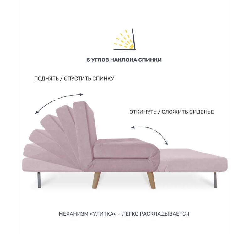 Механизм трансформации улитка - очень прост в использовании, спинка имеет 5 положений: вертикальное «сидя», три дополнительных положения «релакс» и положение «лёжа».