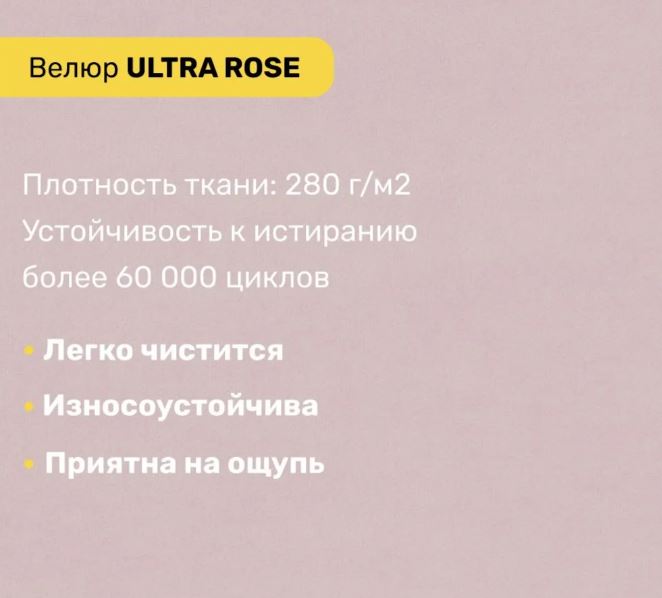 Обивка устойчива к истиранию, по тесту Мартиндейла более 60 000 циклов, это обеспечит долгий срок службы и простой уход. Тактильная поверхность с супермягким ворсом сделает ваш отдых незабываемым.