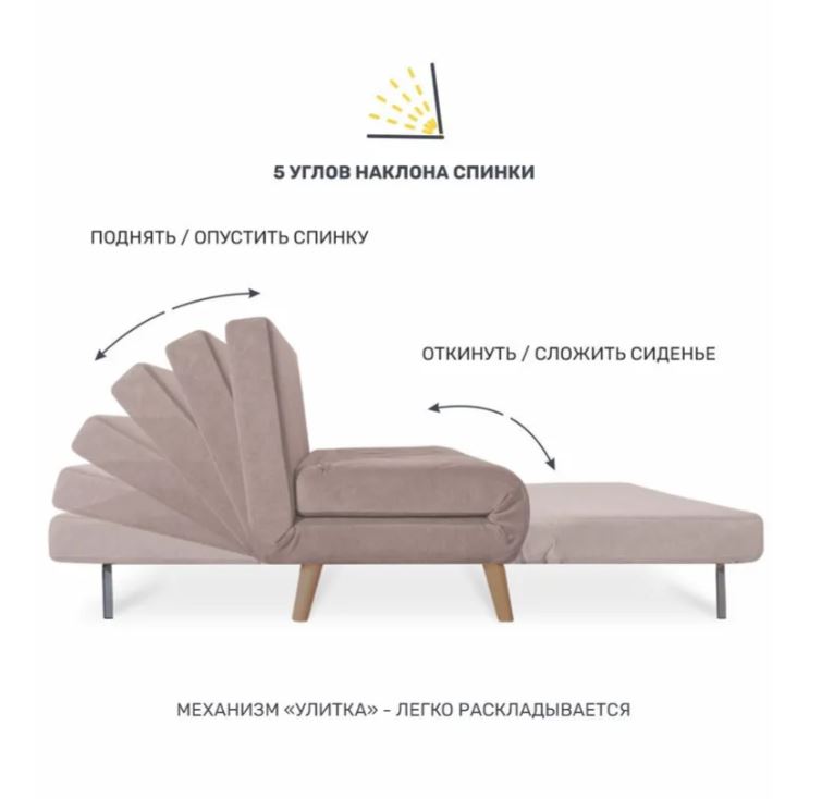 Механизм трансформации улитка - очень прост в использовании, спинка имеет 5 положений: вертикальное «сидя», три дополнительных положения «релакс» и положение «лёжа».