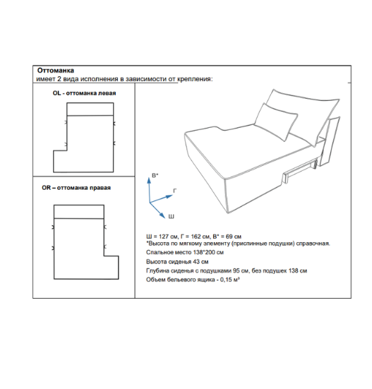 Ш = 127 см, Г = 162 см, В* = 69 см